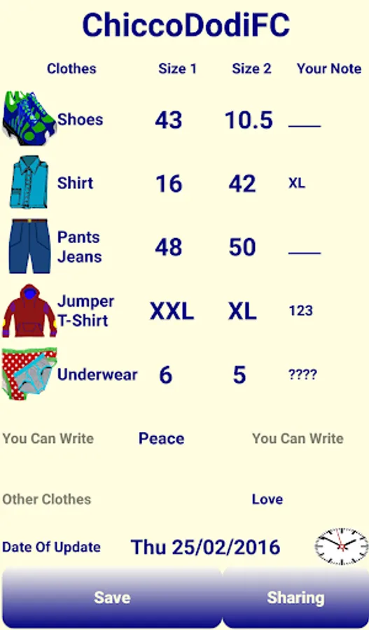 For every outfit you have two sizes values to be entered and a short note (if you want).