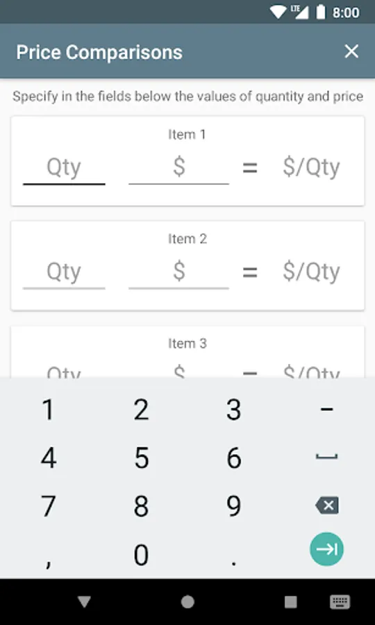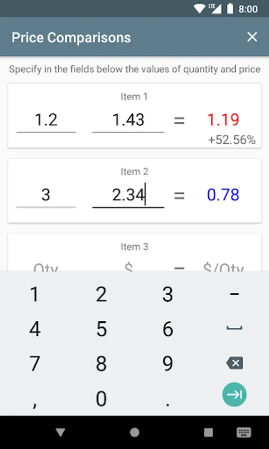 Price Comparisons allows you to compare item prices with different quantities. For example 1.2 lbs for $1.43 vs 3.0 lbs for $2.34. You can find which one has the best price per lb.