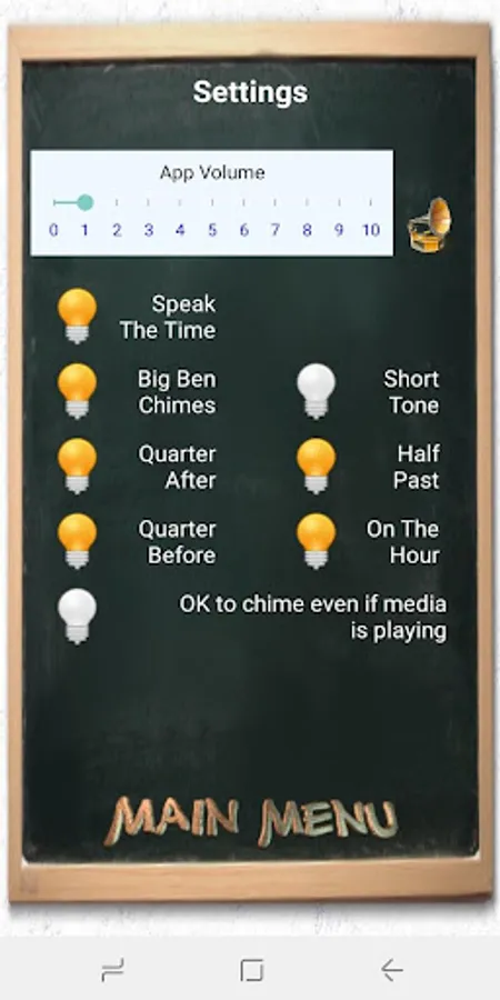 The “Settings” screen has a volume slider and light bulbs that toggle between on an off. To hear the current app volume, tap the speaker icon next to the slider. This screen contains these settings: