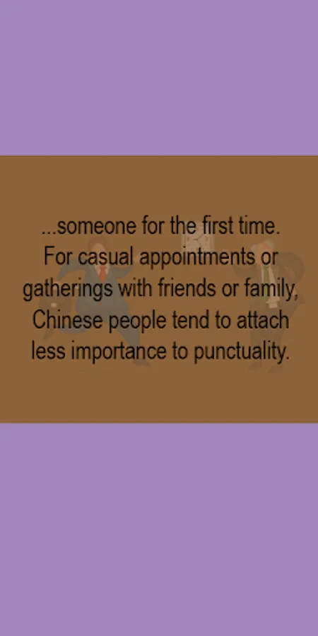 >> The Chinese are often punctual and will generally arrive at the designated time, particularly when meeting someone for the first time. For casual appointments or gatherings with friends or family, Chinese people tend to attach less importance to punctuality.