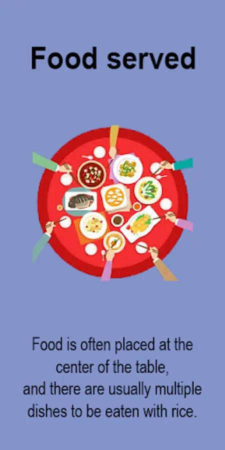 >> Food is often placed at the center of the table, and there are usually multiple dishes to be eaten with rice.