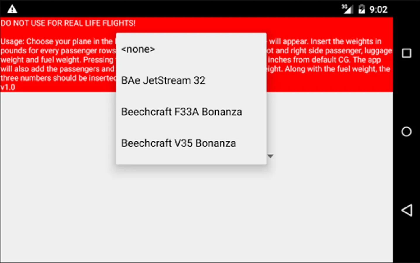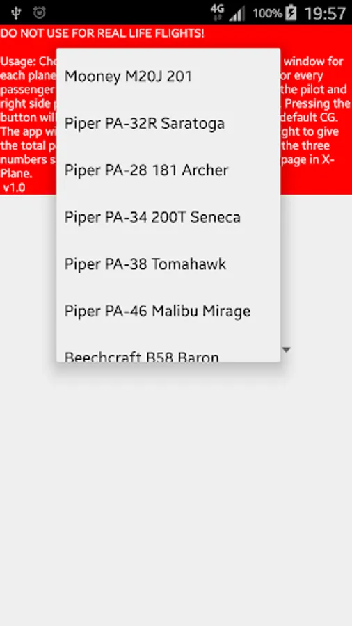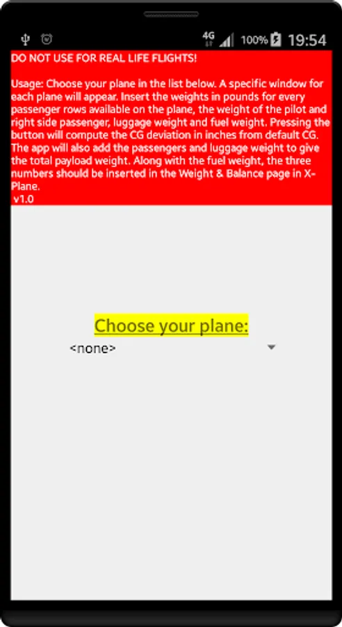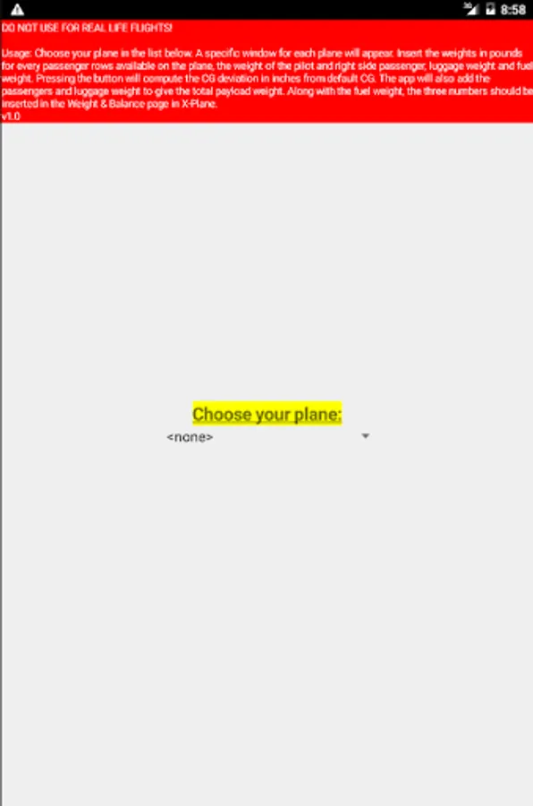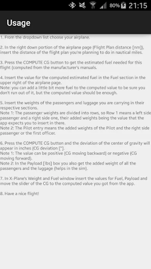 This app lets the user choose an airplane model (42 planes in v2.5) and then insert the weights of the passengers, luggage and fuel. The app will then compute the center of gravity deviation from default center of gravity (empty weight center of gravity). The user can then insert the results into X-Plane's Weight & Balance page. The app also employs a fuel estimation module based on manufacturer published cruise speed and fuel consumption.