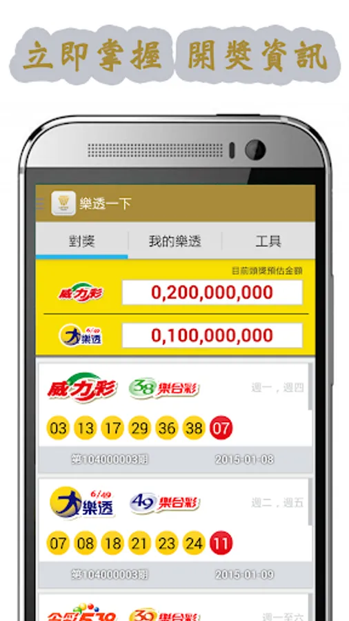即時取得「大樂透」與「威力彩」頭獎累積總額。