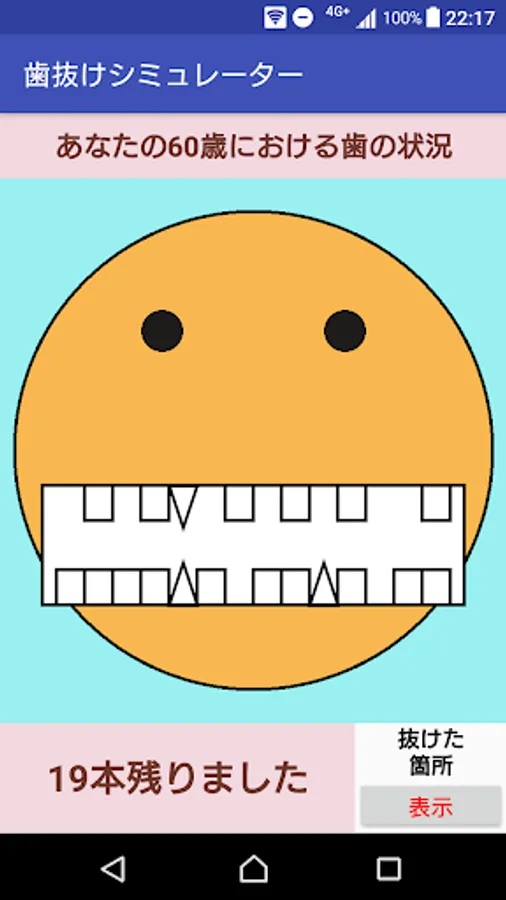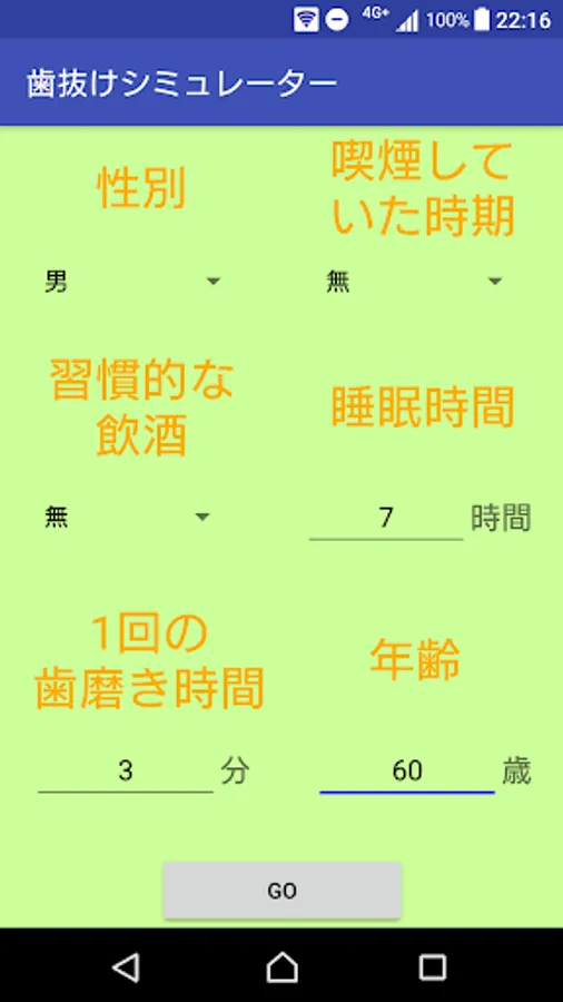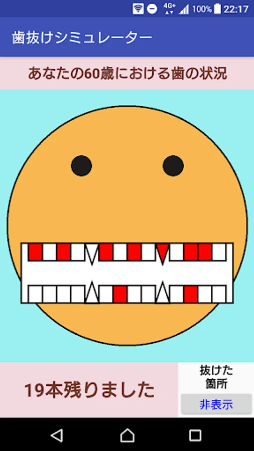 性別、年齢、喫煙の有無など6つの項目から、歯の状態を予測するアプリです。某歯科医院に訪れた、約1000名の患者様の歯のカルテを利用し、分析しました。未来の年齢を入れることによって、将来の歯の状態を予測することも可能です。