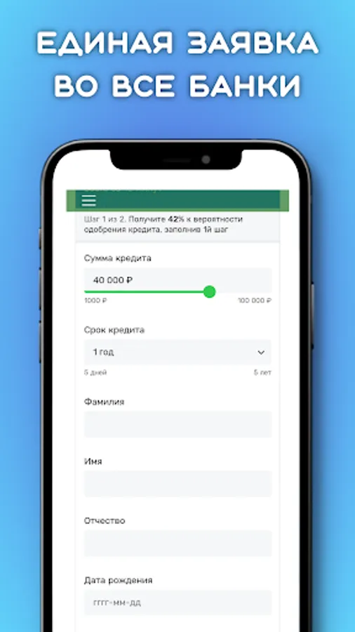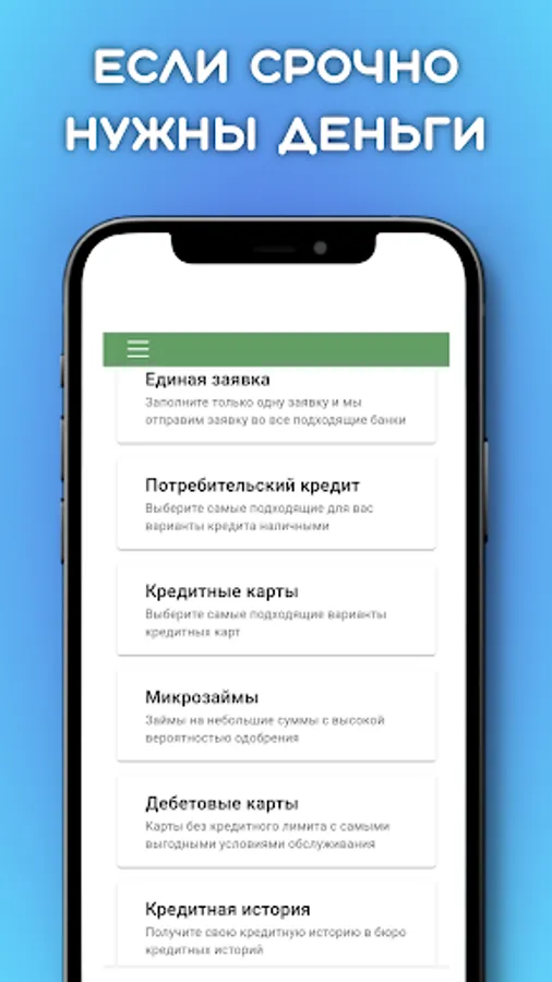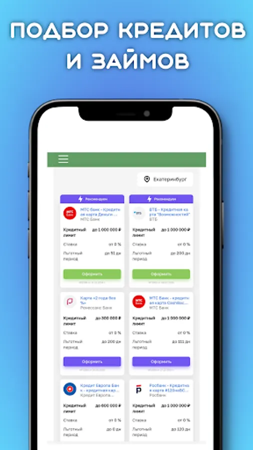 The application selects loans and microloans for free with a high probability of approval in banks and microfinance organizations. The application allows you to send an application, quickly calculate the conditions, get approval in a few minutes and immediately apply for a loan online.