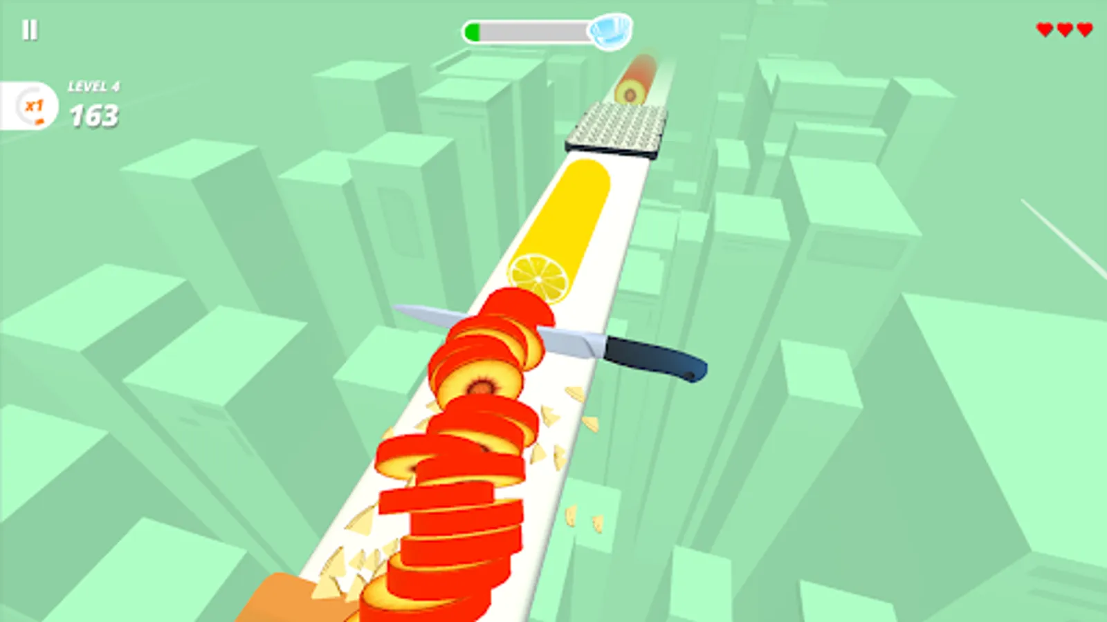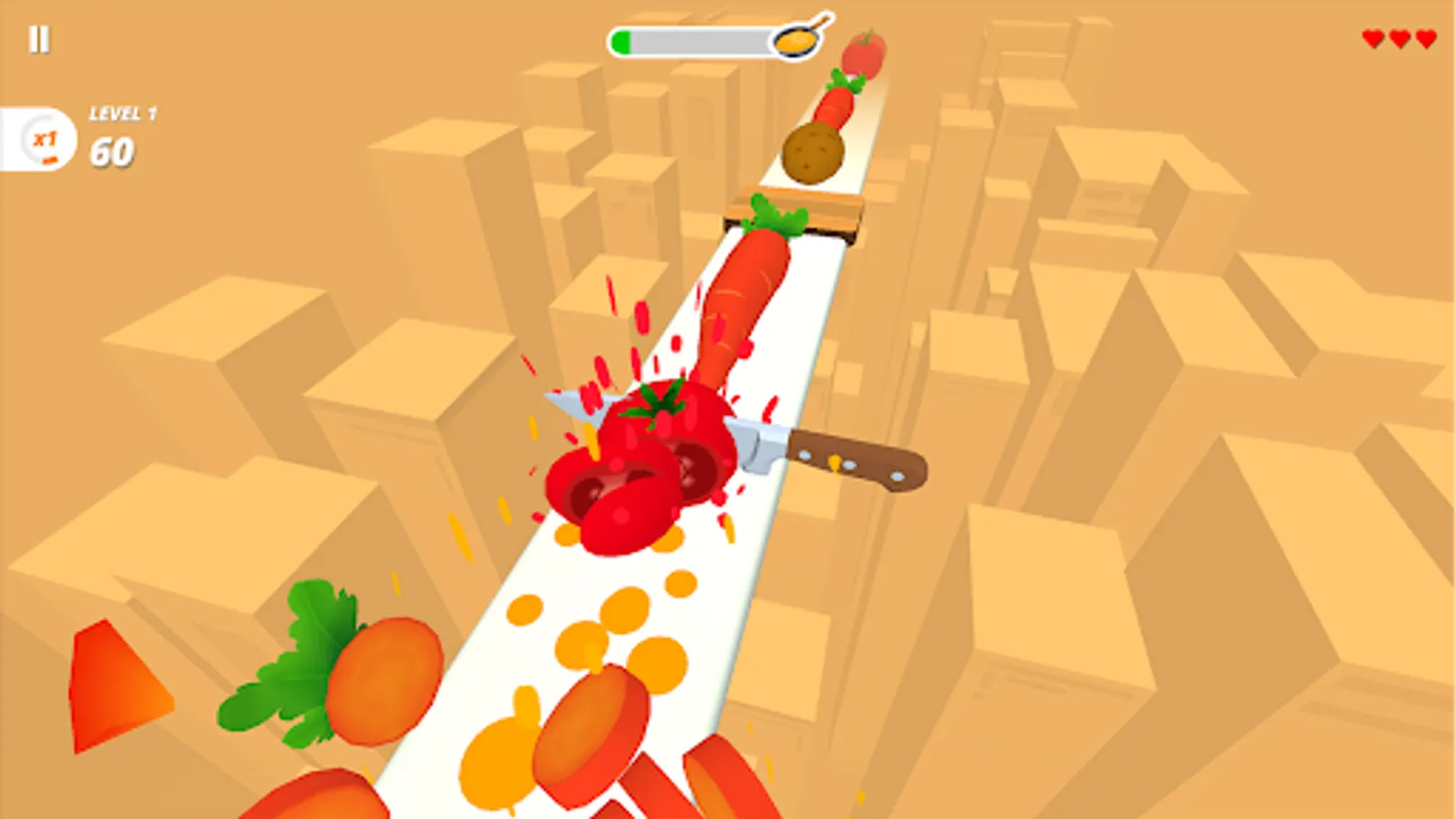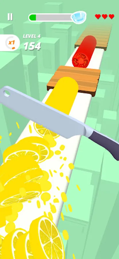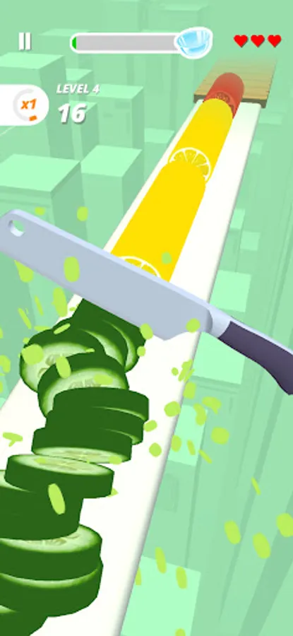 To perfectly slice fruits & veggies with different cutting styles, you have to tap and hold the mobile screen and listen the knife Sounds.