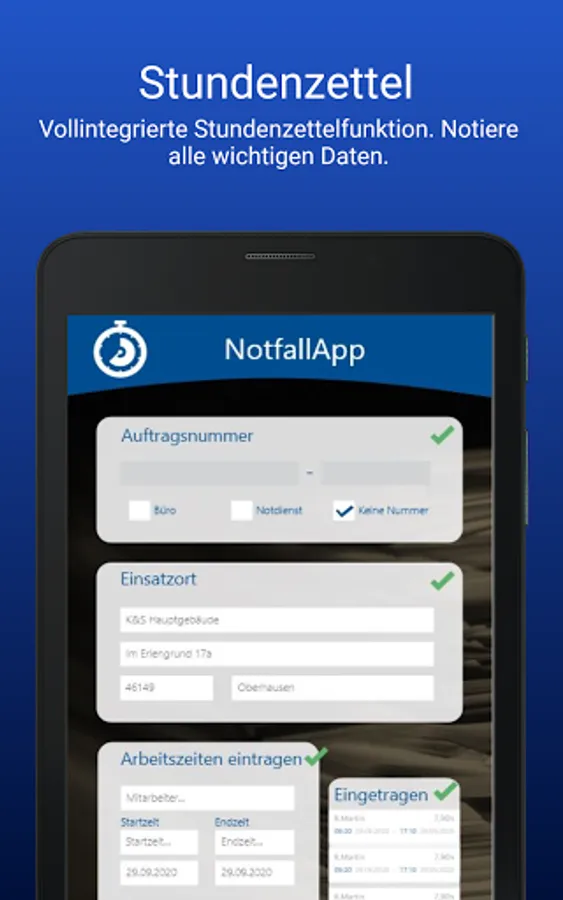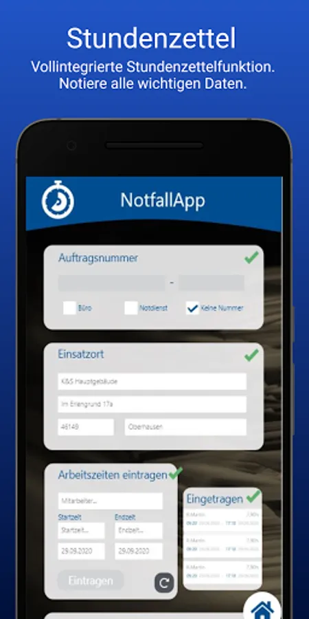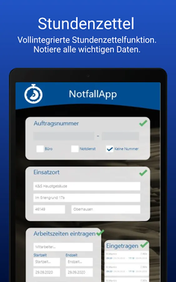 With the help of the timesheet function, you can digitally record all the necessary data and no longer have to fill out emergency forms! Just fill in all fields, attach photos and have the customer sign in the signature field. As soon as all fields are filled in you can complete the slip and sign it yourself.