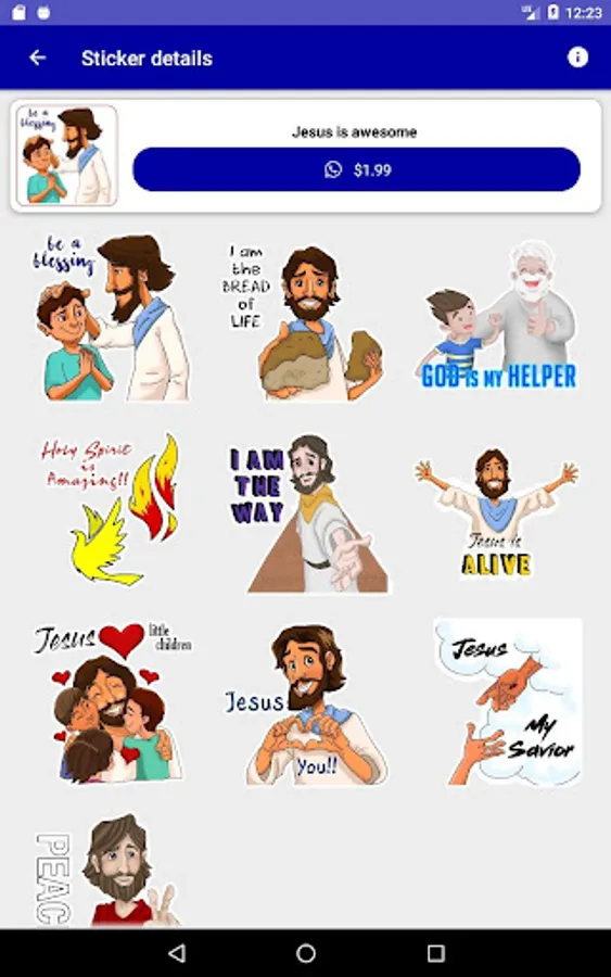 We have stickers ranging from Jesus, fellowship and many others. Some of the themes also relate to words you can use in the church. Thing of popular Bible words like Amen, King of Kings, Jehovah Jireh, all these can be found in this app.