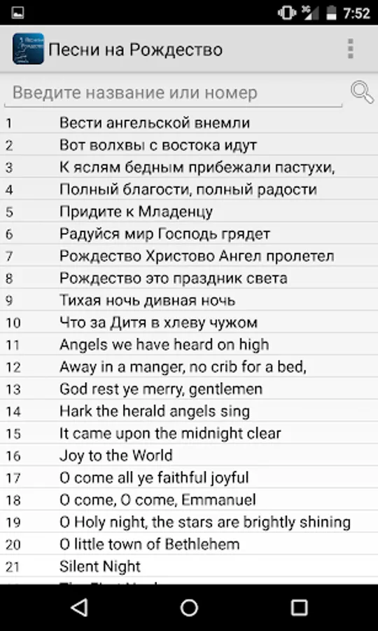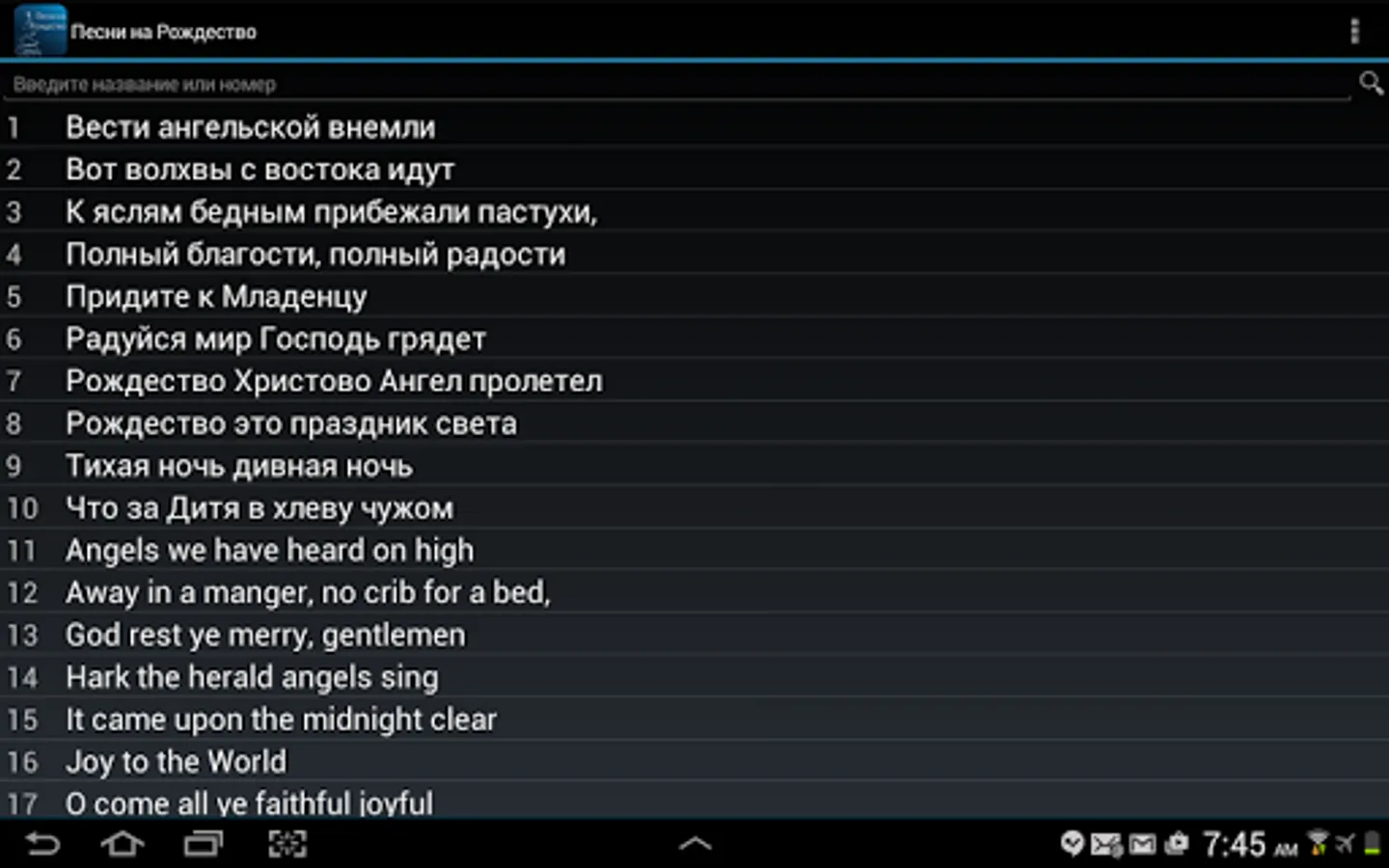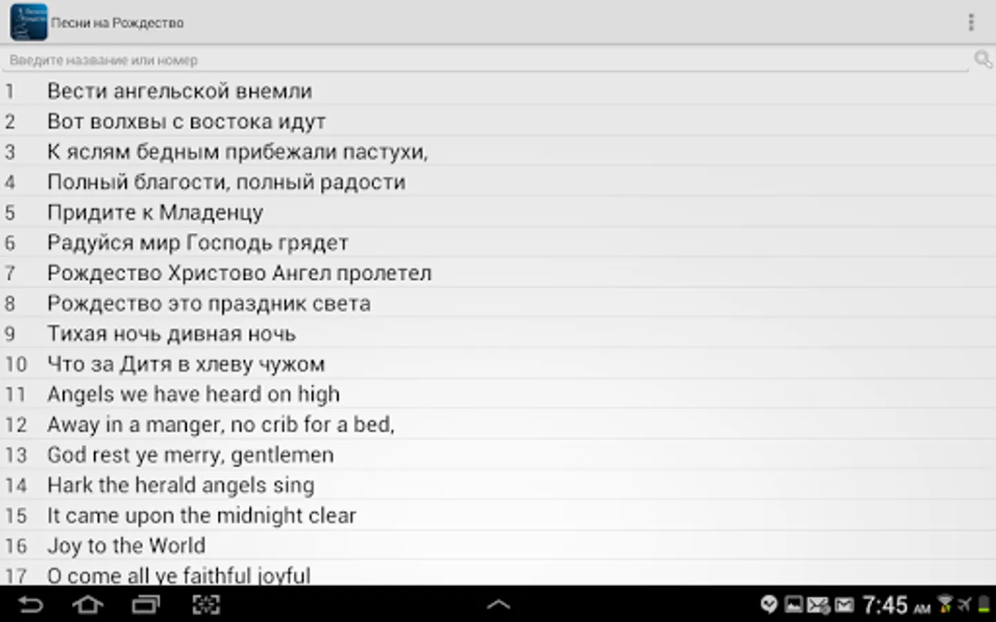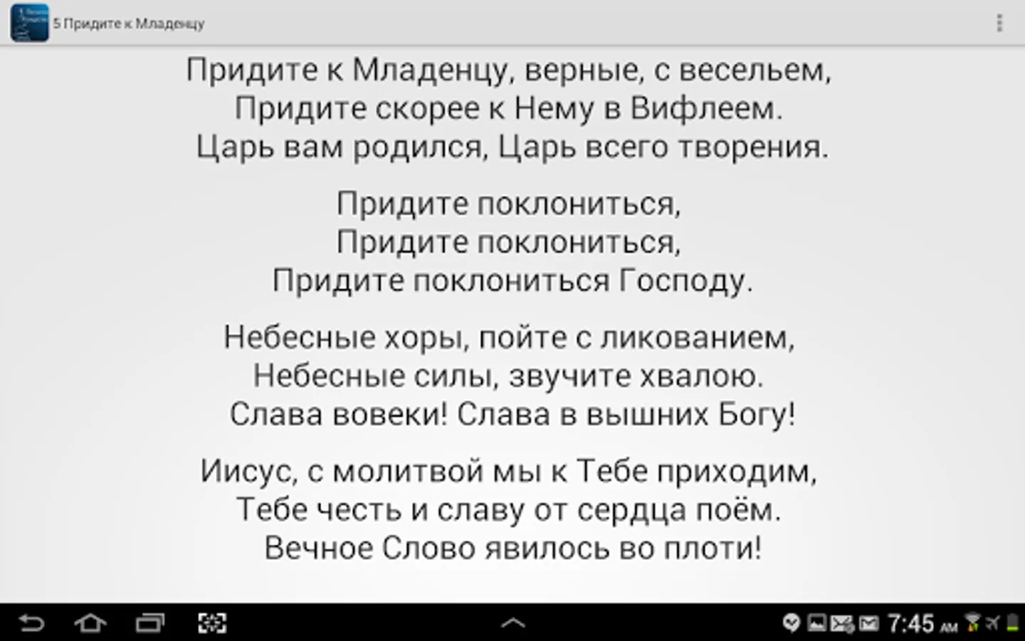 This app was developed to have a quick access to Christian Christmas songs for gatherings with family and friends. The app contains Christmas songs in Russian and English languages. We tried to include most frequently used songs to keep list short for speedy access to particular song.