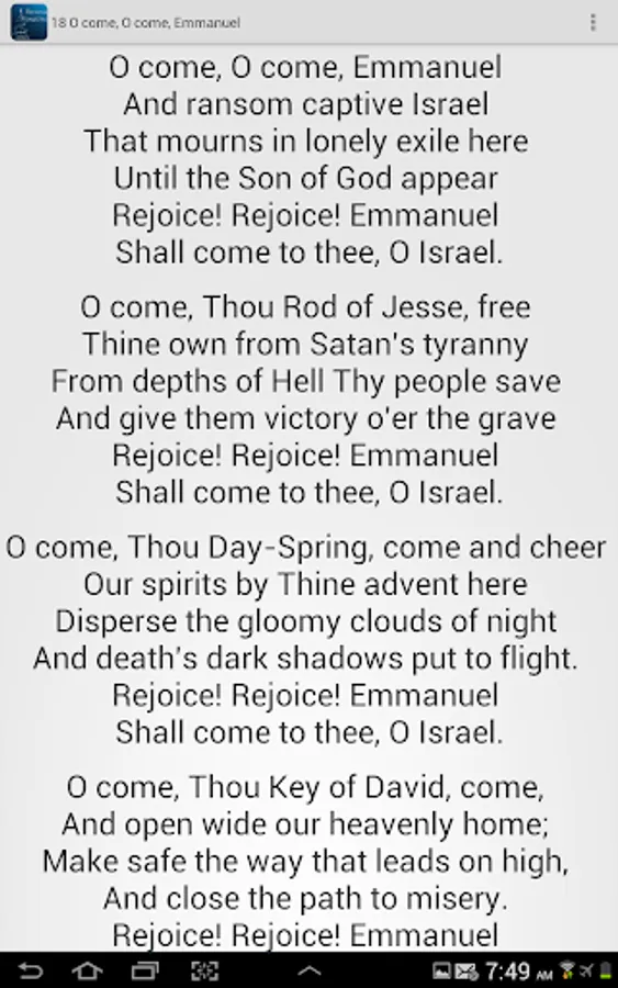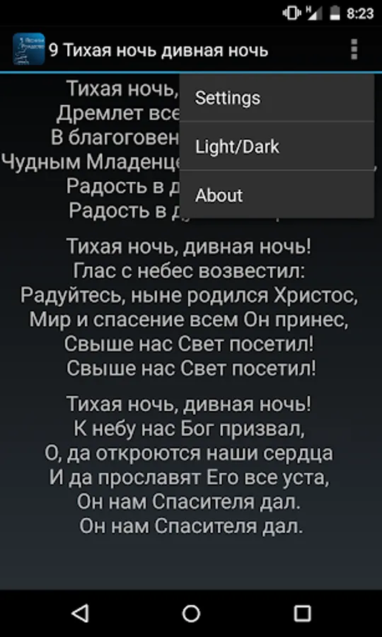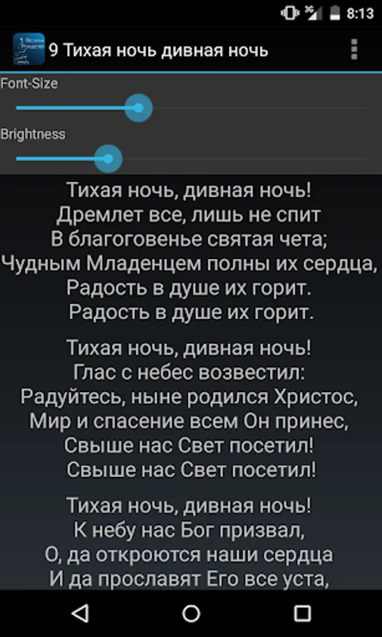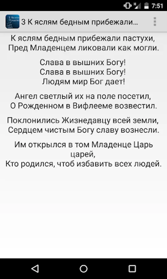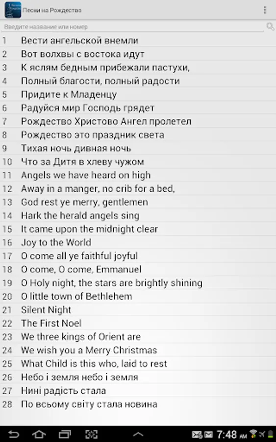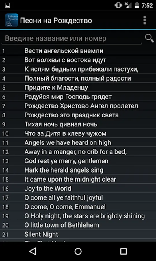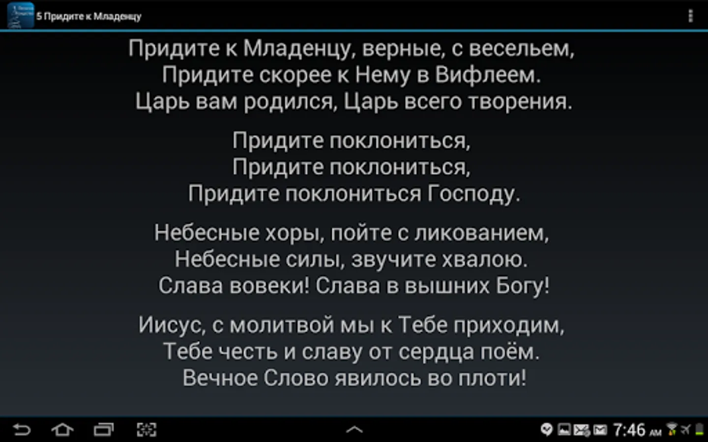 This app was developed to have a quick access to Christian Christmas songs for gatherings with family and friends. The app contains Christmas songs in Russian and English languages. We tried to include most frequently used songs to keep list short for speedy access to particular song.