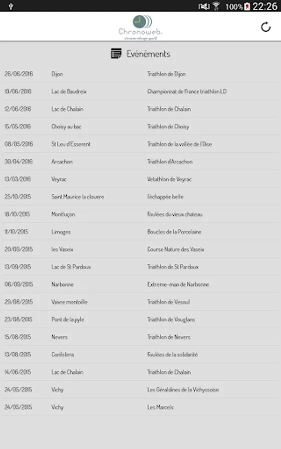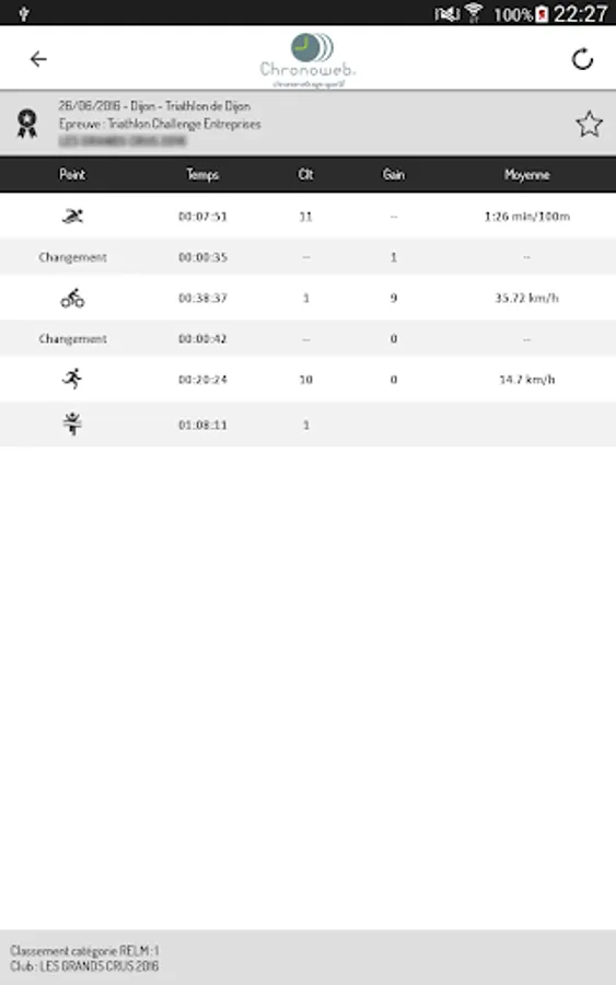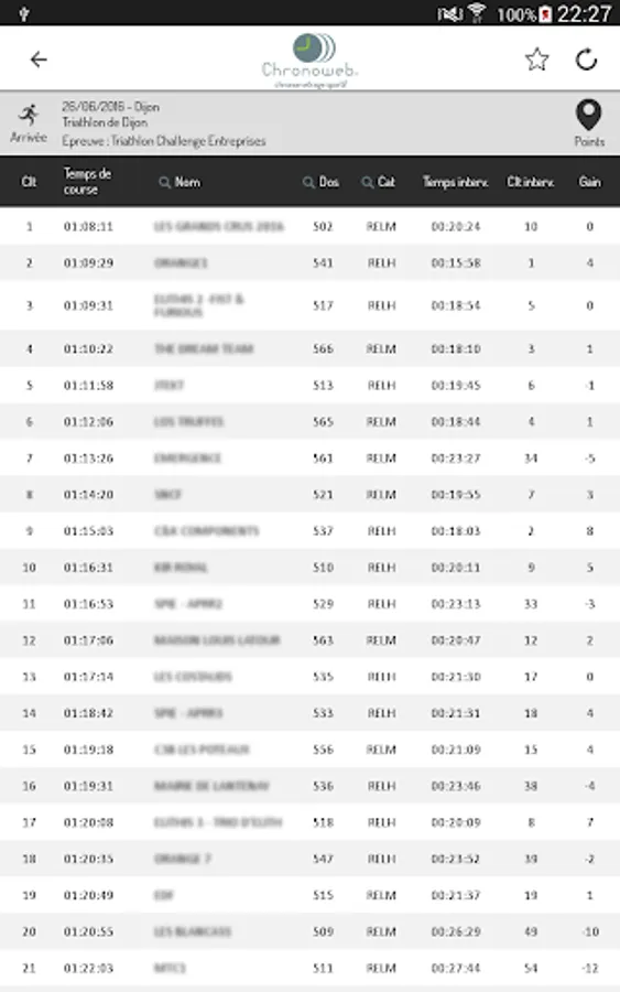 Application that allows anyone equipped with a Smartphone or a Tablet, retrieve live and this throughout the race, all time rankings of the event. Each rider can therefore consult all time upon arrival, but also throughout his race if he runs with his Smartphone and so see the evolution of his classification at each point by Chronoweb timed. His relatives also can track its performance through the application, whether present or not on site. Times are also broadcast live on chronoweb.com. Finally, a web page is easily viewed on a smartphone, these results will be formatted in the application for optimal playback information on this type of device.