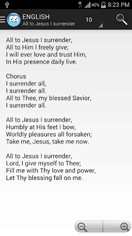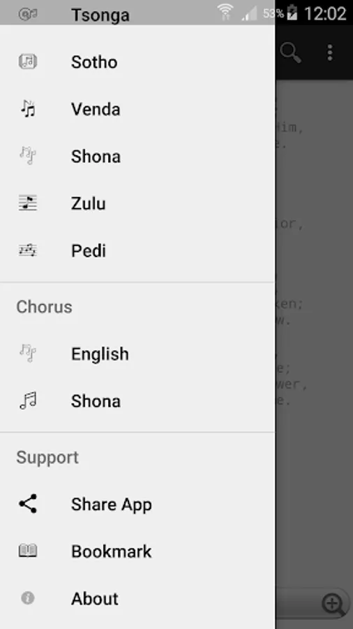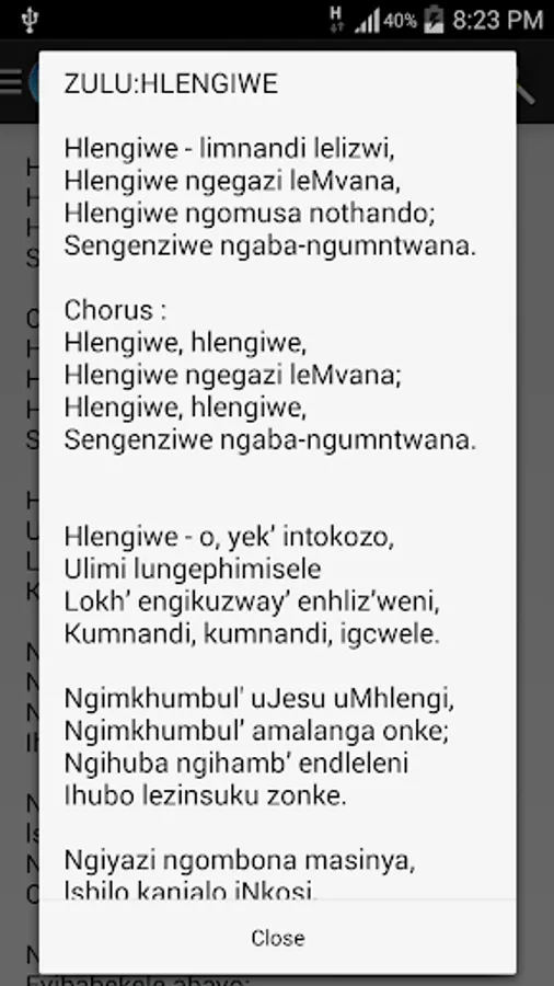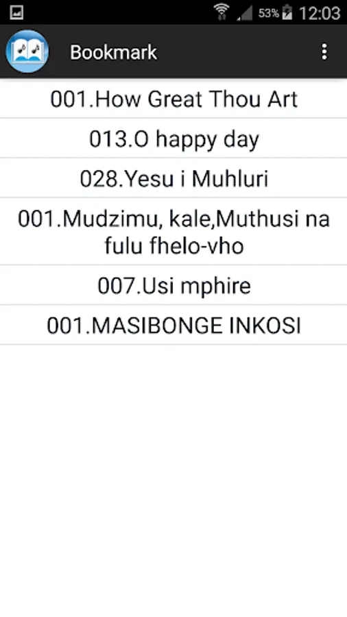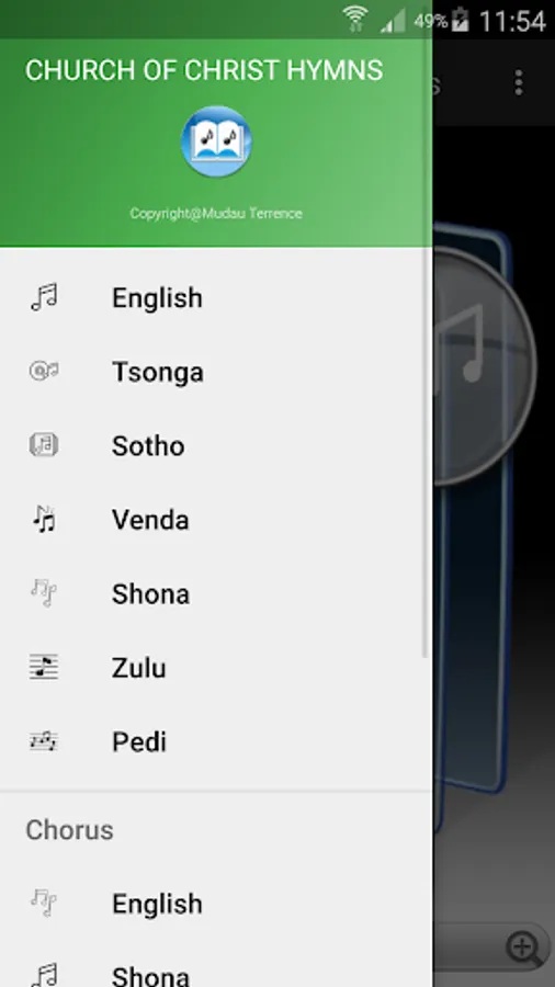 Application contains Church Of Christ Hymns in different languages. It has English, Shona, Pedi, Zulu, Venda, Sotho and Tsonga hymns. The main functionality is to view songs/hymns while singing and it also have supporting functionality such as zoom, song bookmark, setting and searching hymns. Hymns included are from Icilongo Levangeli, Songs of praise, nyimbo dza vha kreste and nziyo dzokurumbidza