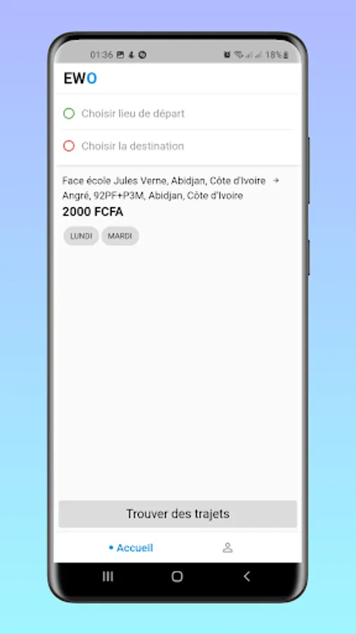 EWO is a carpooling platform in the form of a mobile application connecting drivers going to a given destination on their own account with passengers wishing to share the same journey and the associated costs. Drivers advertise available seats and passengers book them online.