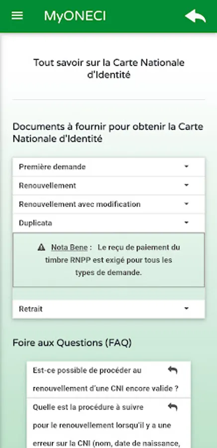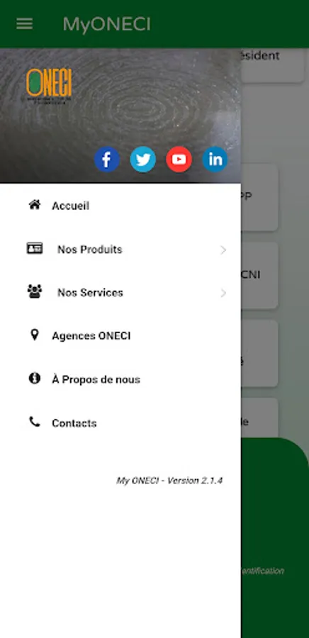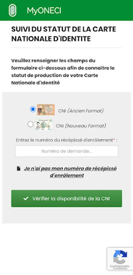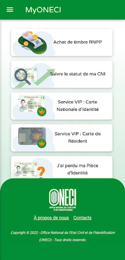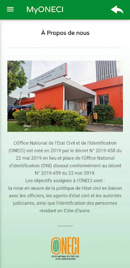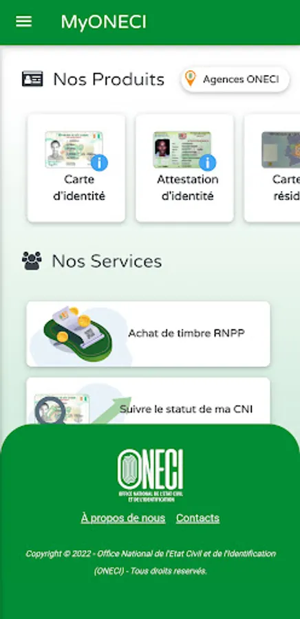 MyONECI is a user-friendly, ergonomic and all-in-one mobile application for smartphones and tablets allowing customers of the National Civil Status and Identification Office residing in Côte d'Ivoire or abroad to easily have access to our various service offers without having to go to an ONECI enrollment center.