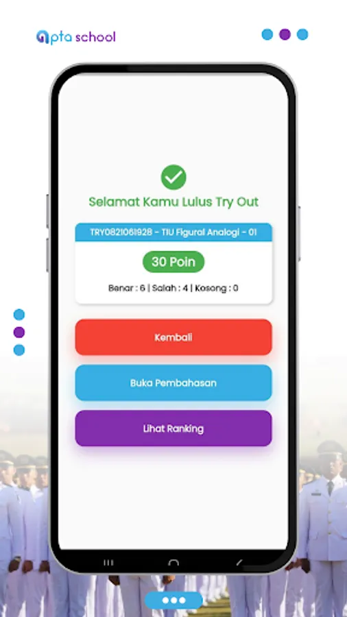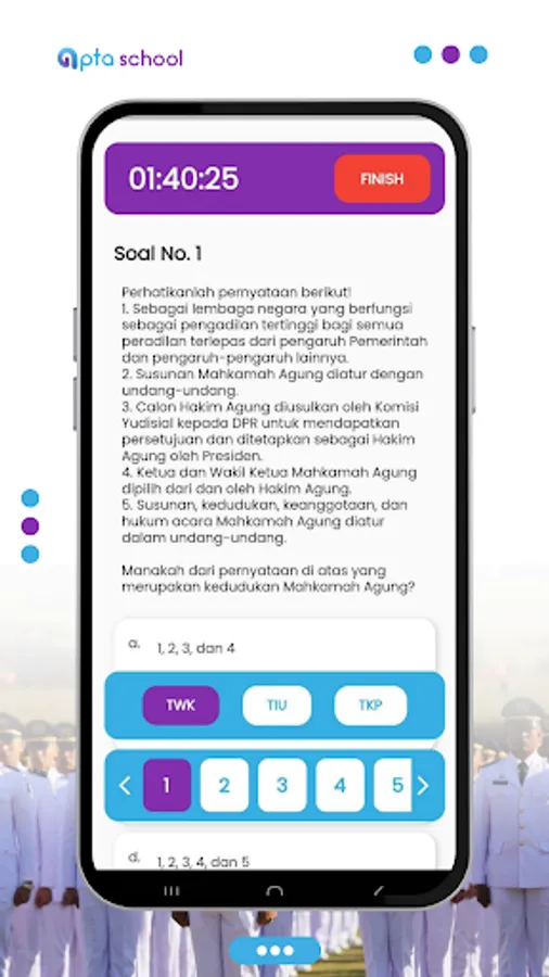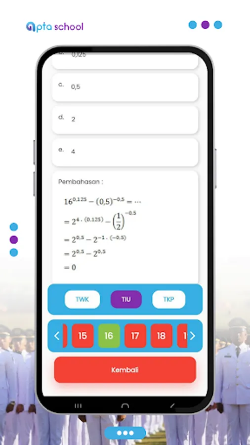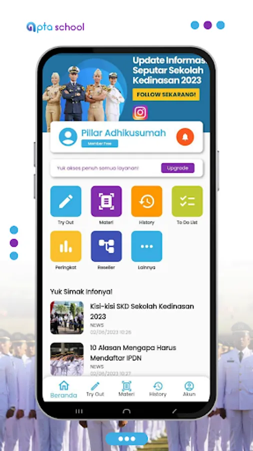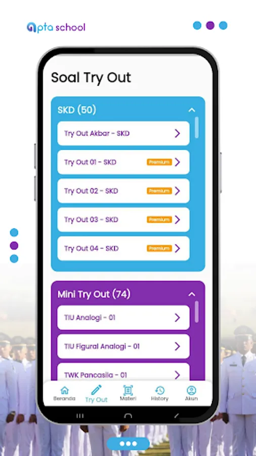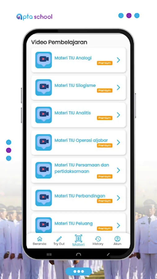 The Official Bimbel Application - Apta School is a learning application for entering official schools such as IPDN, PKN STAN, POLSTAT STIS, POLTEKIM, POLTEKIP, STIN, STTD - Sipencatar and other official schools. The features of this application are: