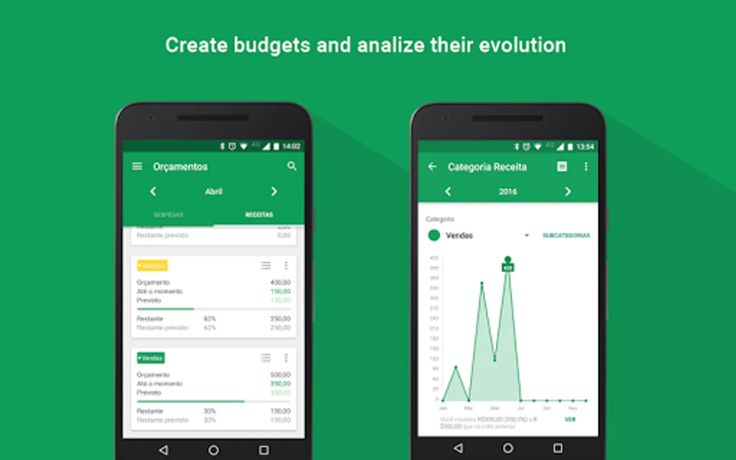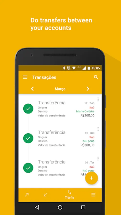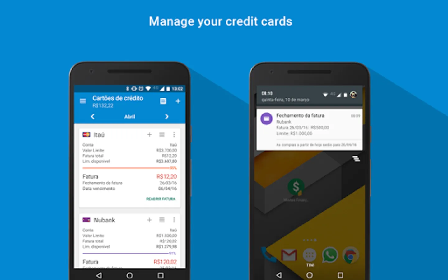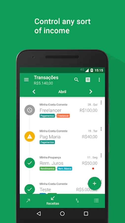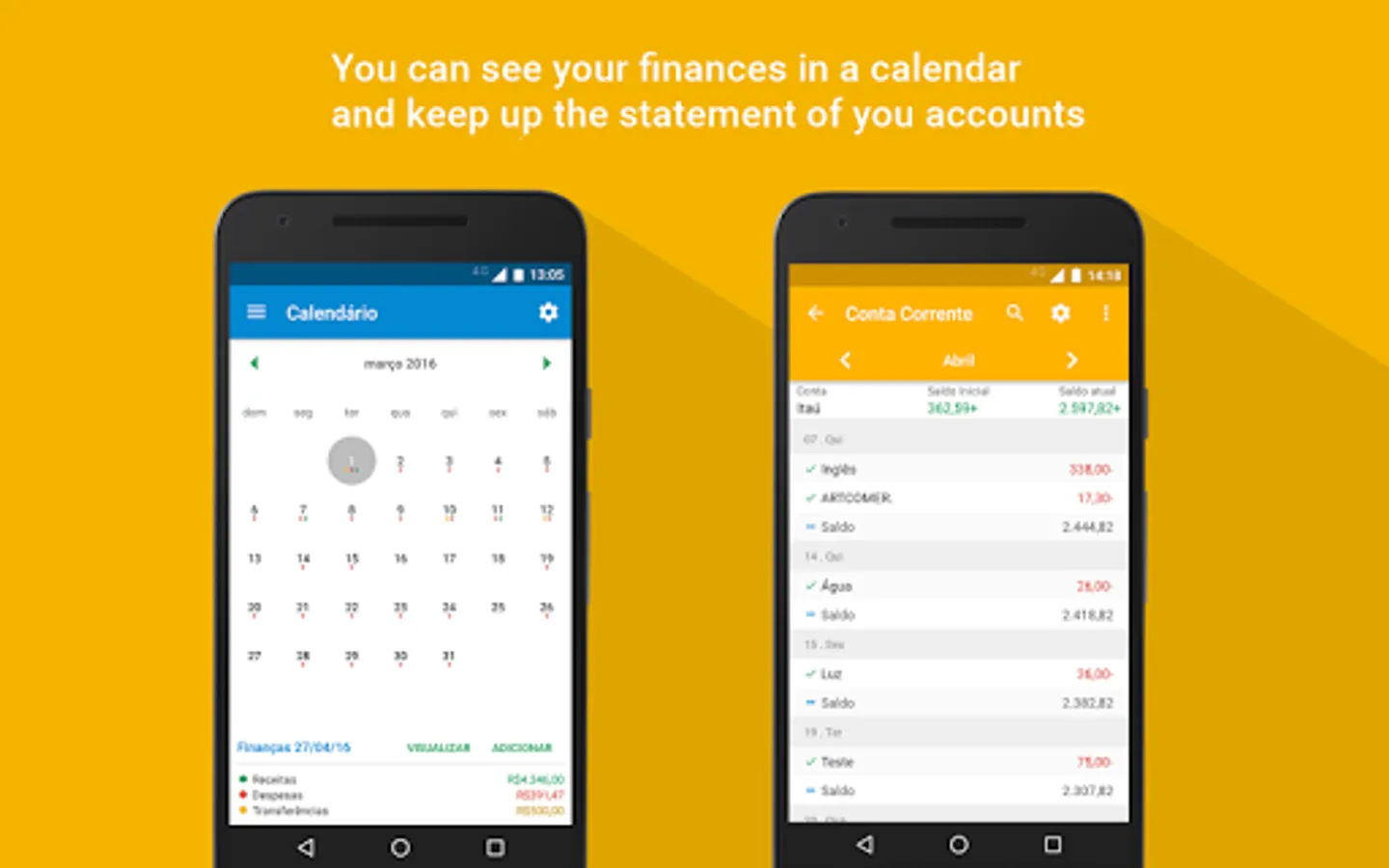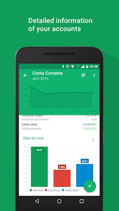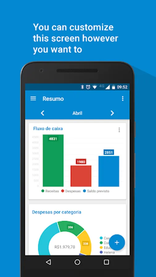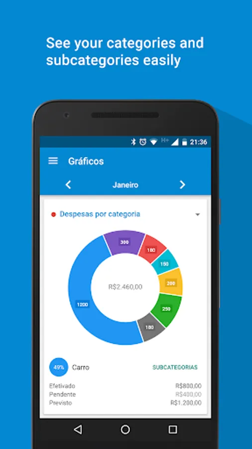 Now you can control your personal finances easily and efficiently. With the app 'My Finance' you can experience how to easily organize and manage your expenses, saving time and getting more money to yourself, at the end of the month. You will have a very effective control of all your financial life. In this version you can add expenses, incomes, categories, besides other freatures. A category can be credit card (for instance), giving you the ability to know how much you are spending with it. You can assign certain expenses and gains so how much is left of that income for you. The app has charts to help you to see better the information, giving the ability to switch between expenses and categories. The pro version is complete! There you can find all features of this version and more, like other types of graphics and unlimited resources.In the pro version you can sync your 'My Finance' Calendar with your Google Calendar. You can also be notified of overdue expenses both by application and by the selected schedule. You choose. Enjoy!