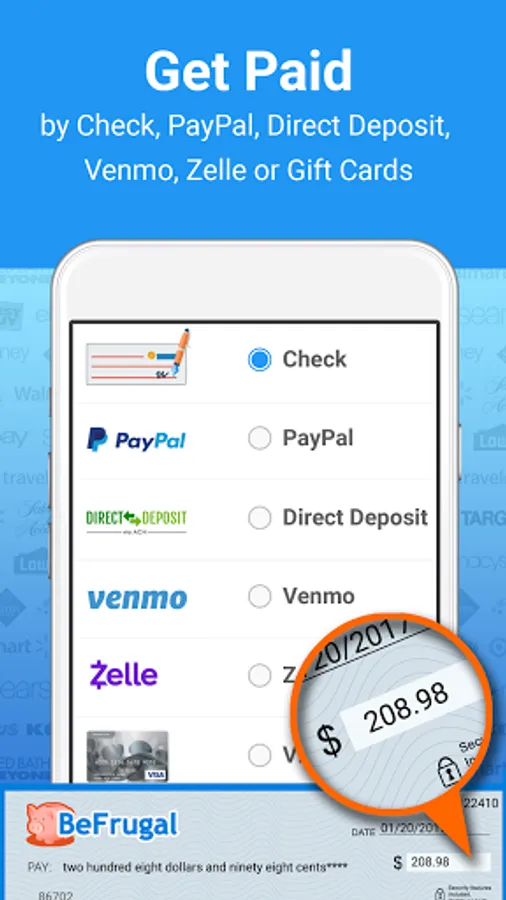 Get paid via Check, Direct Deposit, PayPal, Venmo, Zelle or Gift Card.
