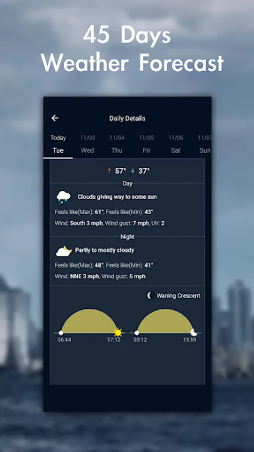 It show the weather information in 14 days and current temperature, show the accurate time of sunrise and sunset, humidity, wind force and ultra-violet index.