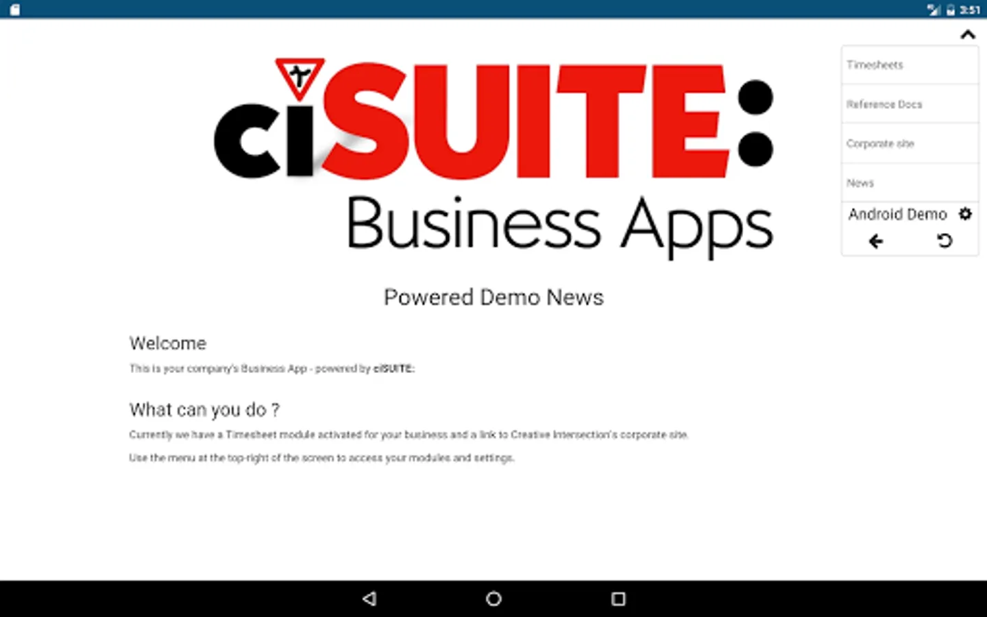 If your employer has purchased a non-branded "Powered by ciSUITE:" business app service, you can use this app to access those features of your service that are available for mobile!