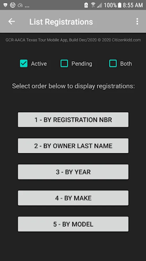 It displays a listing of current registrations, both Active (paid) and Pending (registered, but not yet paid). And drilling down from there, listings can be sorted by Registration Number, Owner Last Name, Vehicle Year, Vehicle Make or Vehicle Model. Continuing from there, individual registration information is displayed based on selection.