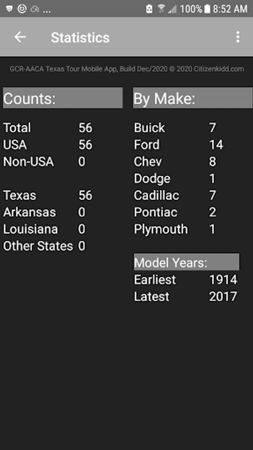 This application also displays summary statistics for the Tour's registrations, such as total registered and from where (US state), and registrations by make (Chevy, Ford, Dodge, etc.).