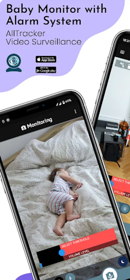 For example, AllTracker Video Surveillance can be used as a baby monitor. You can see and hear your baby anytime, anywhere. The app will give a warning sound signal on the remote smartphone if the baby wakes up and starts making sounds. You can also remotely talk to your child and calm them down while you are away. If the room is dark, you can turn on the flashlight. To save Internet traffic, the camera can be turned off and only audio transmission can be used.