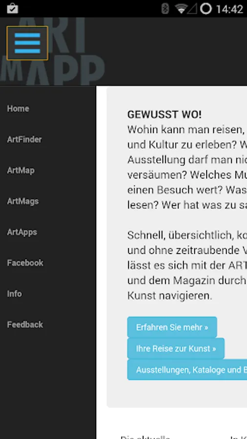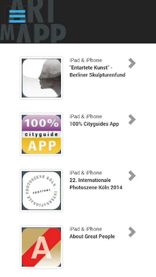 The ARTMAPP app contains more than 10,000 exhibition locations in the D/A/CH region and Luxembourg, whereby the user can search for museums, galleries, art fairs, hotels, restaurants, tourist information, save the results in a favorites list or use them immediately as a tip to friends via e-mail or Facebook.
