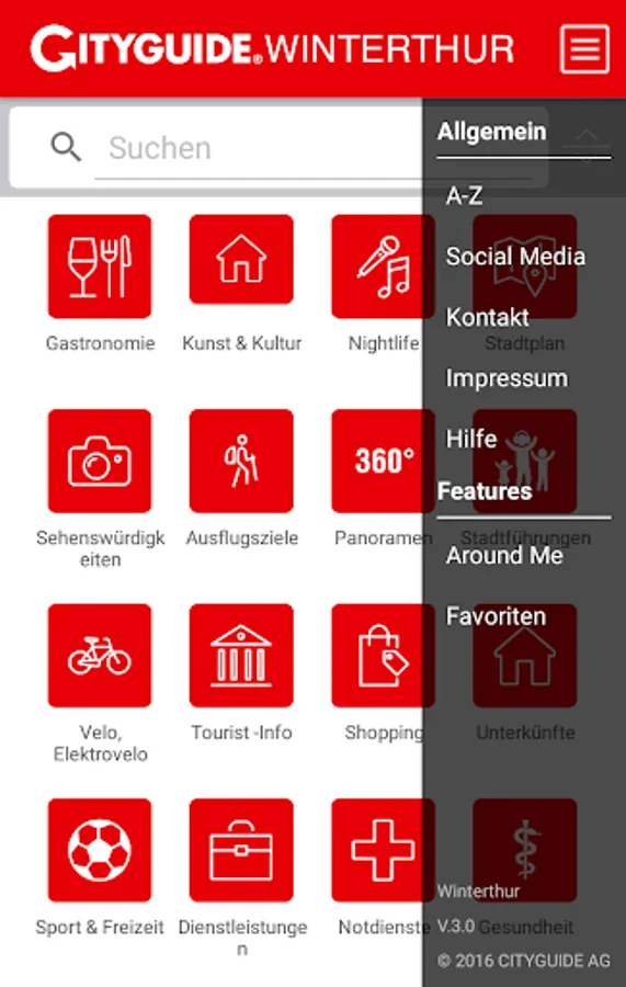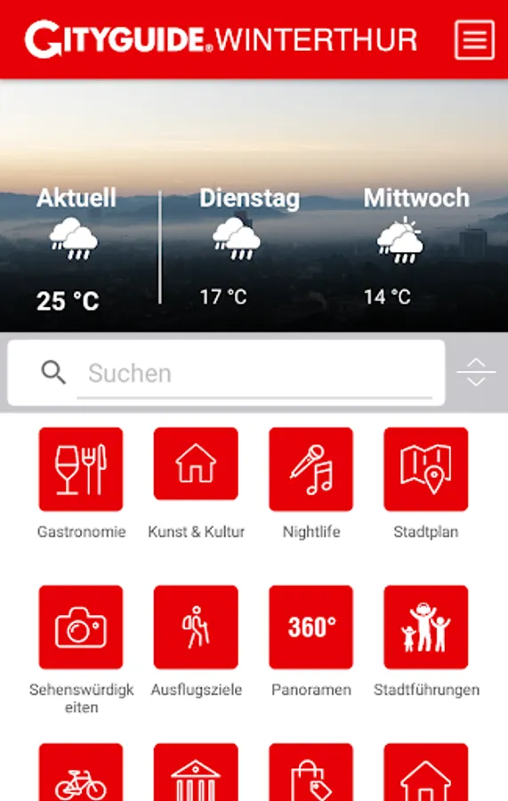 With the CITYGUIDE Winterthur you have the entire city digitally for your trouser pocket and all the important information around the clock at your fingertips. With the CITYGUIDE you get information about events, top locations, industries and companies on site. Go on a virtual city walk to the shops with the 360 ° panorama function, view opening times, services and brands. Find the nearest restaurant, the next florist, baker or fashion shop with the Search & Around Me feature and benefit from special promotions (offers & coupons) at CITYGUIDE Winterthur.