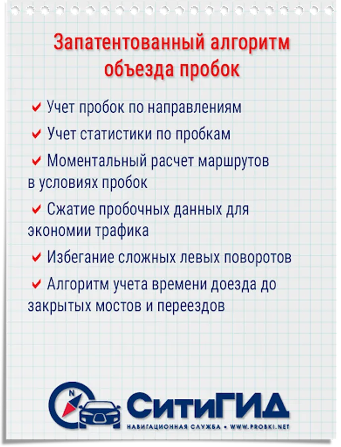 When calculating a route, CityGuide uses our patented algorithm 'Jams-2', which takes into account direction of movement and traffic speeds. If traffic data is not available, statistical data is used instead.