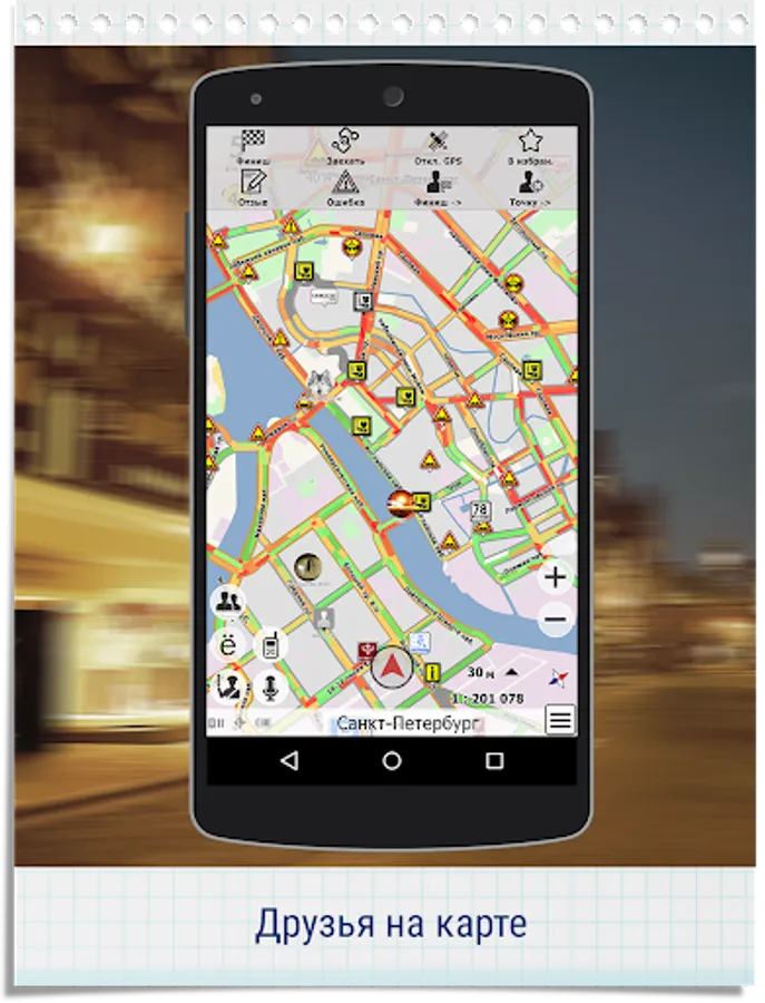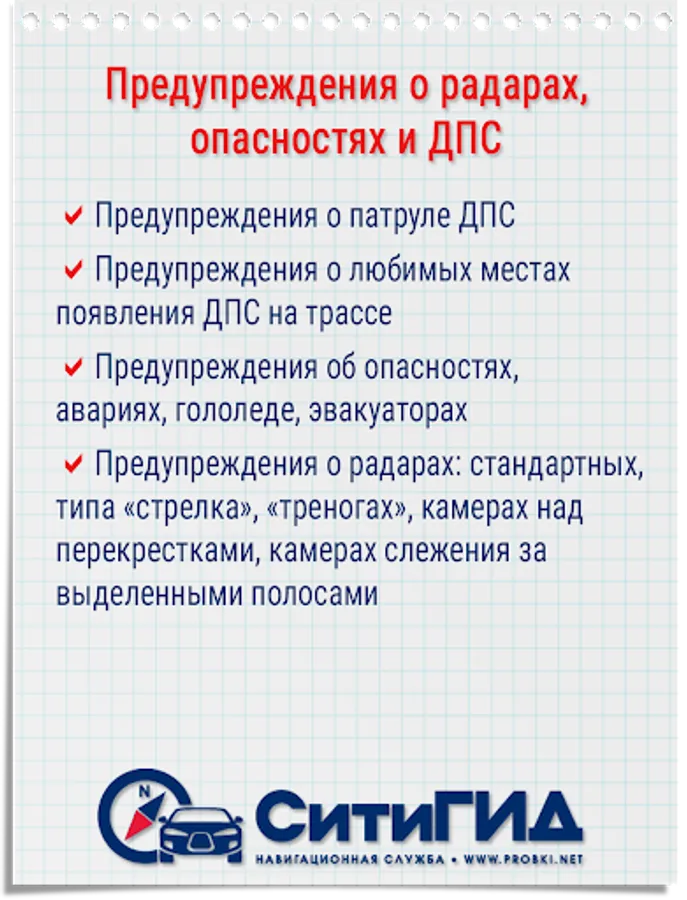 CityGuide users are warned, by voice and visually, about various current events along the route (police, danger area, speedcams, traffic accidents, bad roads, traffic jams, etc.)