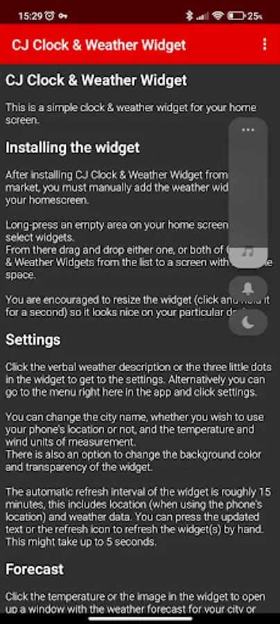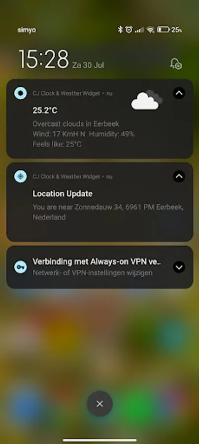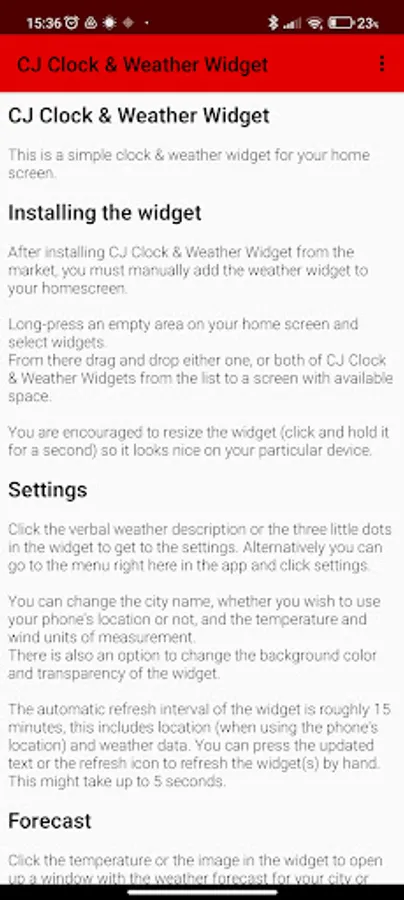 This widget will show you the realtime weather and a clock on your home screen in a small package. Light on resources. You can manually choose to use a city name or use the phone's location. No full screen ads.