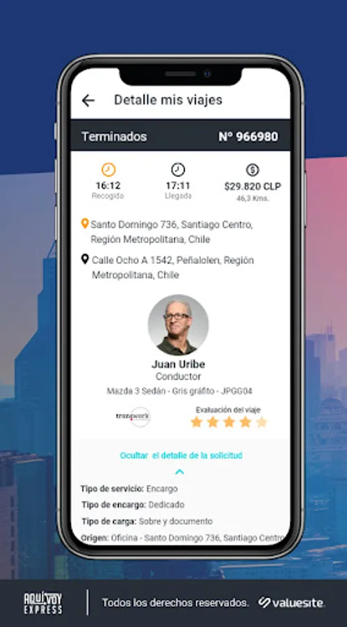 Transwork Aquívoy Express®, allows our users to request or plan trips 24 hours a day, without having to make a phone call or send an email to manage their coordination. In addition, you will be able to know in real time the arrival time of the mobile, know the identity of the driver and assigned mobile and evaluate the quality of the service received.