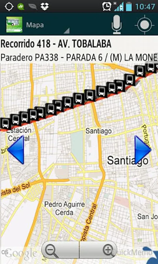 TransantiagoMaster allows you to view a highly detailed map of Santiago de Chile, along with information of transportation lines (Transantiago) and bus stops.