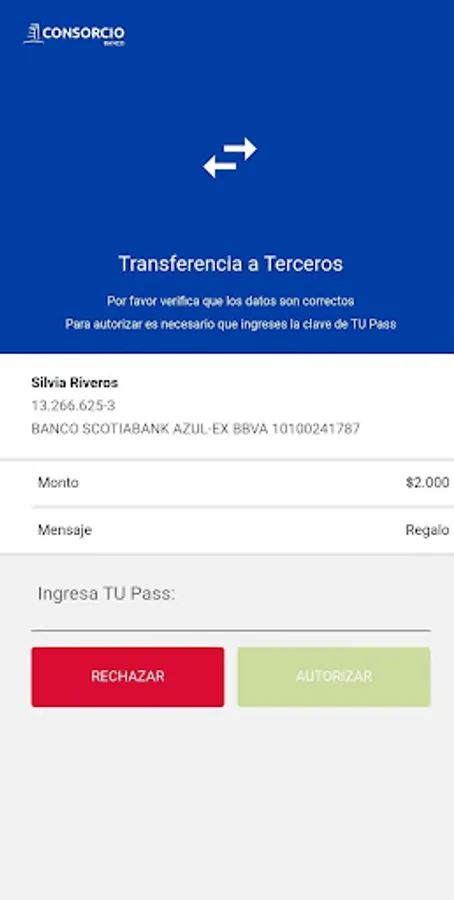 As a bank, we are concerned about your safety, but also about your comfort. Through a rigorous identification process, TU Pass validates your identity and allows you to authorize transfers made with your Banco Consortium App, without you needing to open the application.