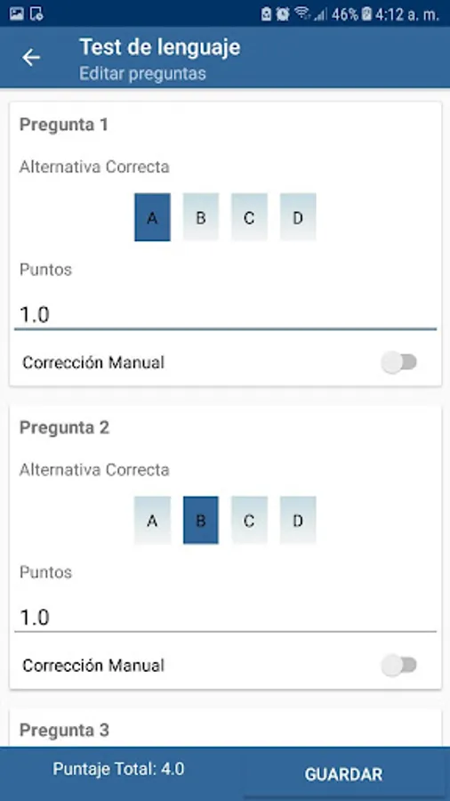 The answer sheet of each student is incorporated into the application, which allows correct proofs of alternatives and true and false.