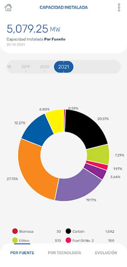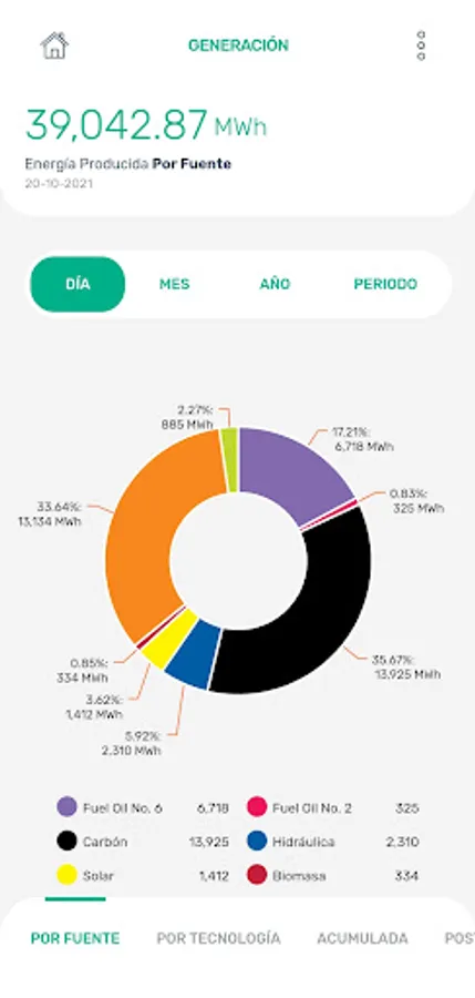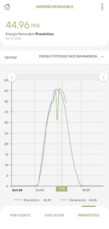 Additionally, the application provides you with an estimate of the greenhouse gas emissions of the electrical system in real time. The values are presented for time periods and allow you to know the hours when the energy generated is cleanest.