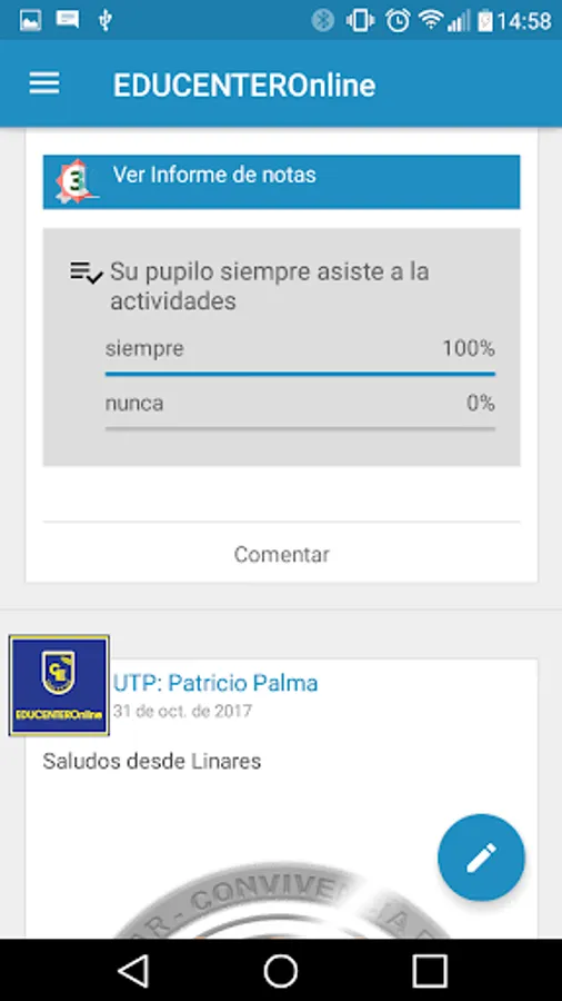 For his parents aside and students, through notifications, events and notices, always be aware of what sent by their teachers, all in a simple and intuitive interface.