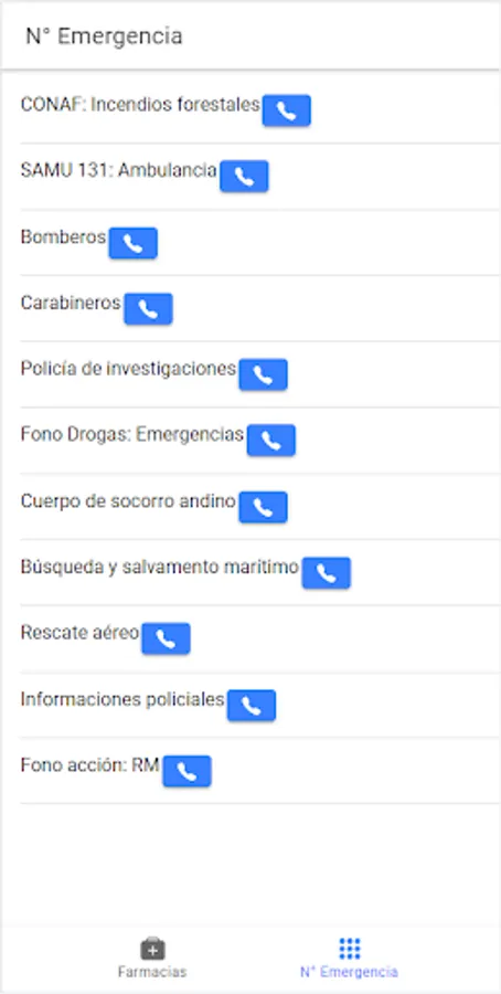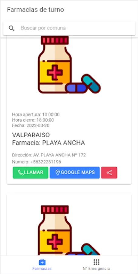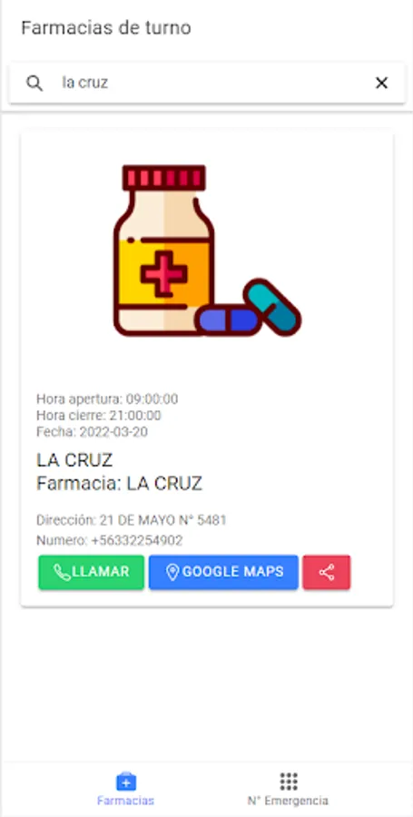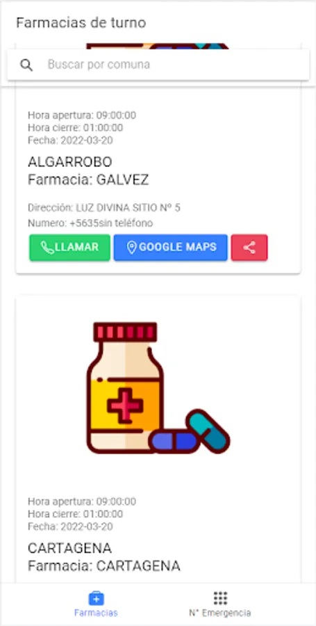 The application manages the official list delivered by the MINSAL to give a better satisfaction and order to the user, this allows you to call and know the exact location of the site to look in addition to showing the operating hours of the place.
