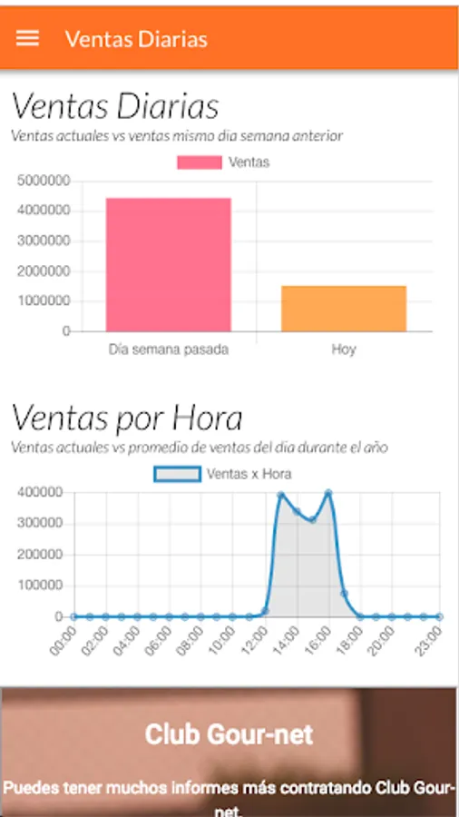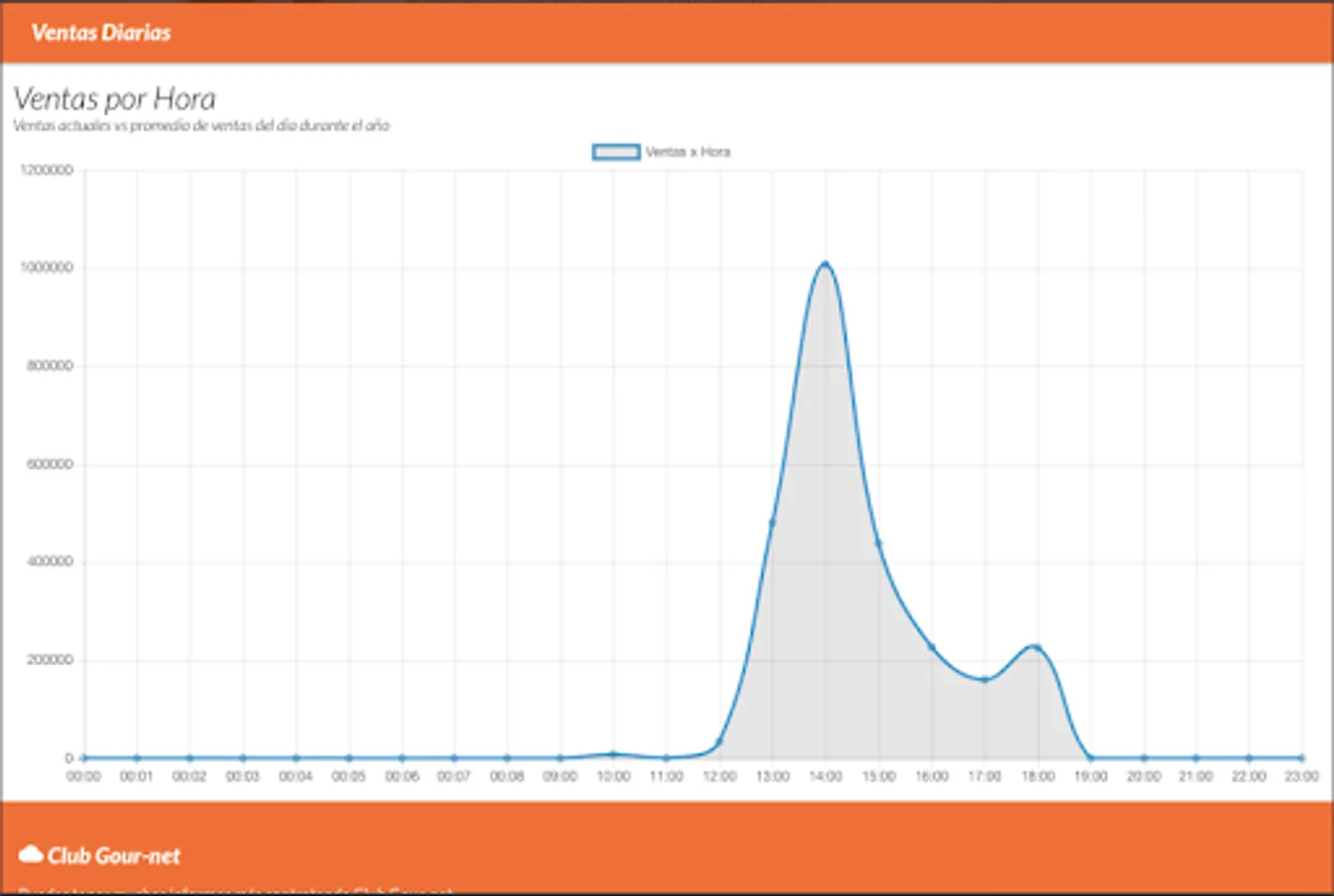 Today you can have your cell phone connected to the POS Gour-net in your restaurant. Check in real time all sales of the day through this new app. You can see the total sales. A bar chart with your current sales vs. your same-day sales from last week and sales per hour.