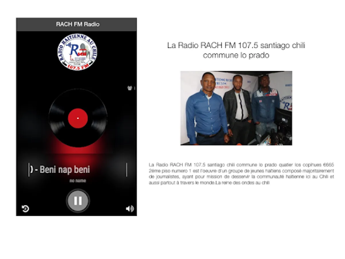 Radio RACH FM 107.5 santiago chili commune the meadow quatier the copihues 6664 2nd floor number 1 est l'oeuvre d'un groupe de jeunes haïtiens composé majoritairement de journalistes, ayant pour mission de desservir la communauté haïtienne ici au Chili et aussi partout à travers le monde.La reine des ondes au chili
