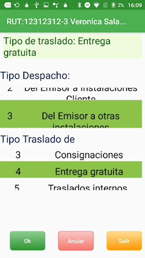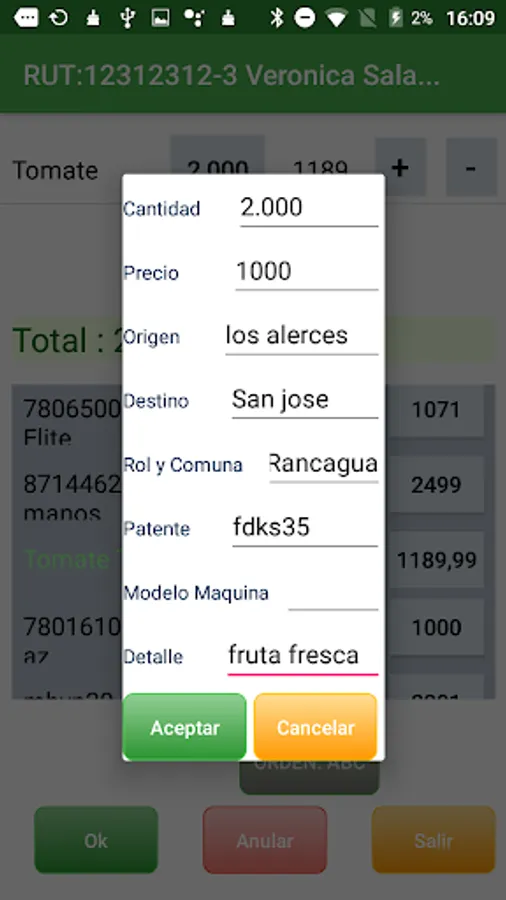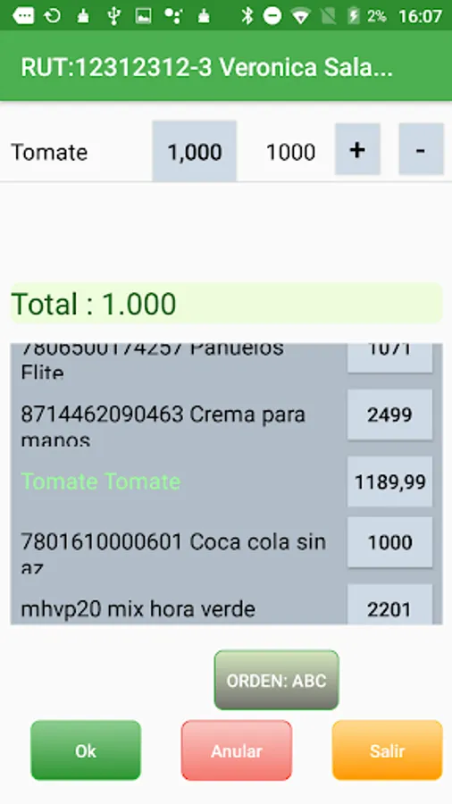 To issue a document the customer's RUT is entered, the products with their quantities are selected.