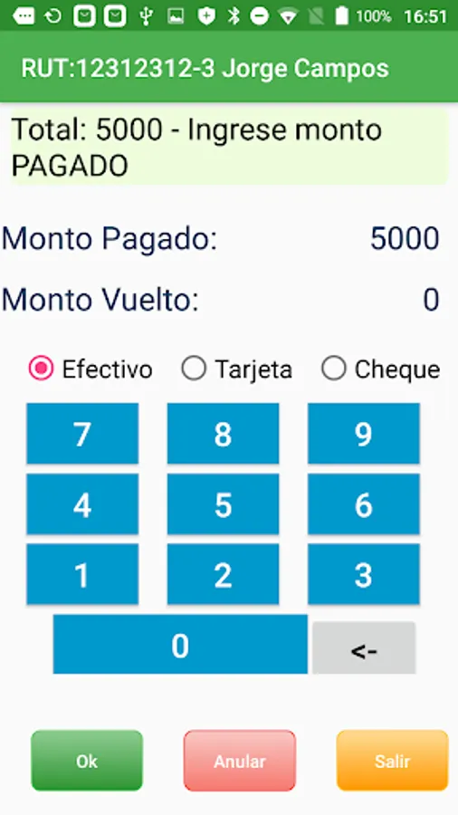 To issue a document the customer's RUT is entered, the products with their quantities are selected.