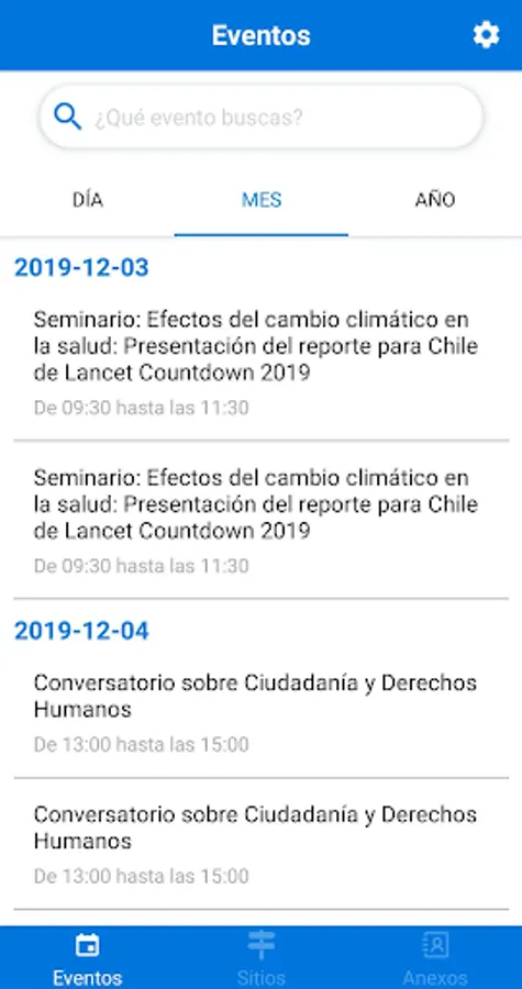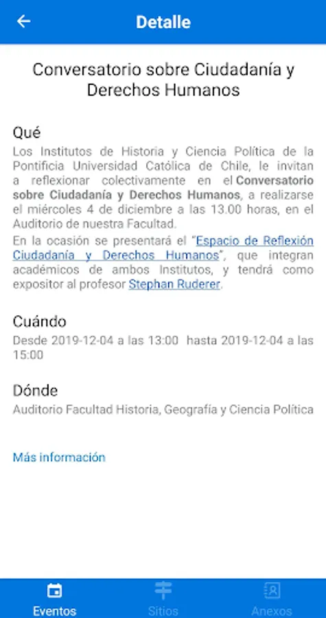 2. Event information: Through a search engine, you can find the events that take place in the UC organized by date. Each event contains a description, organizer, dates and place where it will be held. For events with an associated site of interest, the application shows the location of the event on the map and allows you to open the location in any map provider of the device.