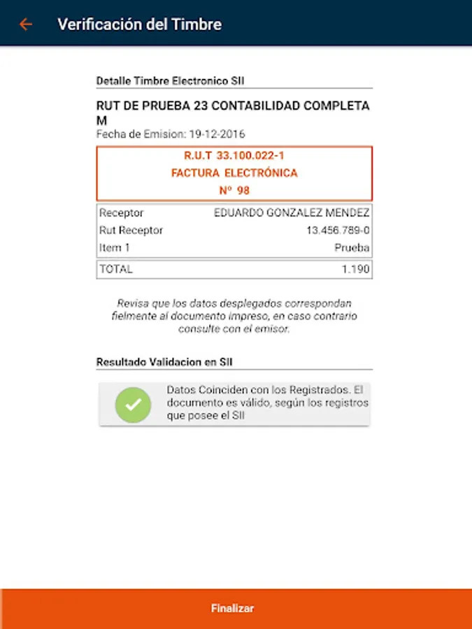5. Check online the validity of the document, verifying if the folio consulted is received in the SII and if the information is consistent, that is, if the RUT data of the sender and receiver, the date of the document and the amount correspond total.