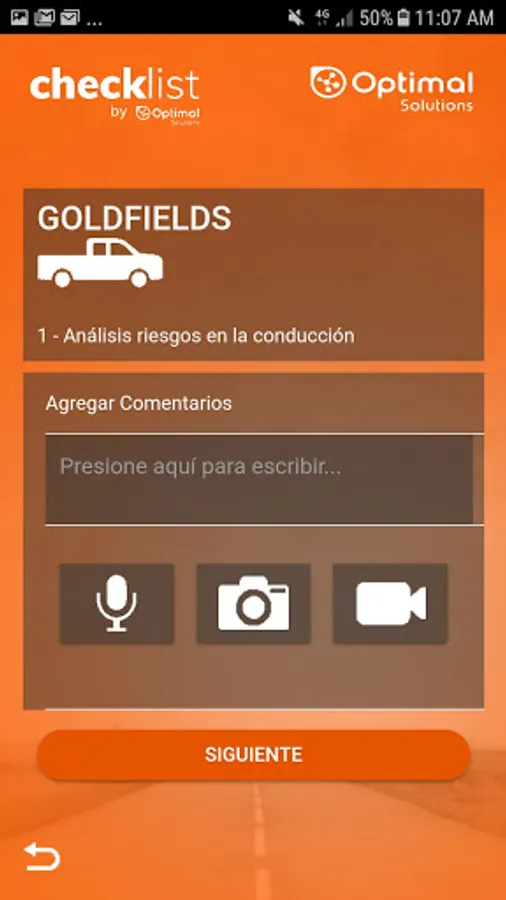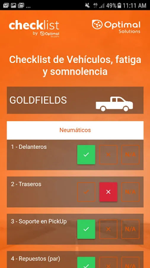Checklist is a support application for companies, which was created and can be used to meet the requirements and review the operation of vehicles and support in obtaining knowledge regarding safety measures. This application allows you to reject a checklist, allowing you to enter a comment, a voice note, a photograph or a video to save evidence. The operation of the tool is simple and effective for companies. In order to use the application, the company must sign a contract with Optimal Solutions and enter vehicles and questionnaires according to the type of vehicle. Users must only be registered in advance by the requesting company. Thus providing a very quick overview of the status of the vehicles and knowledge gathering. As a consequence, we find an improvement both in the revision and repair of the vehicles and in the efficiency and optimization of some of the company's processes.
