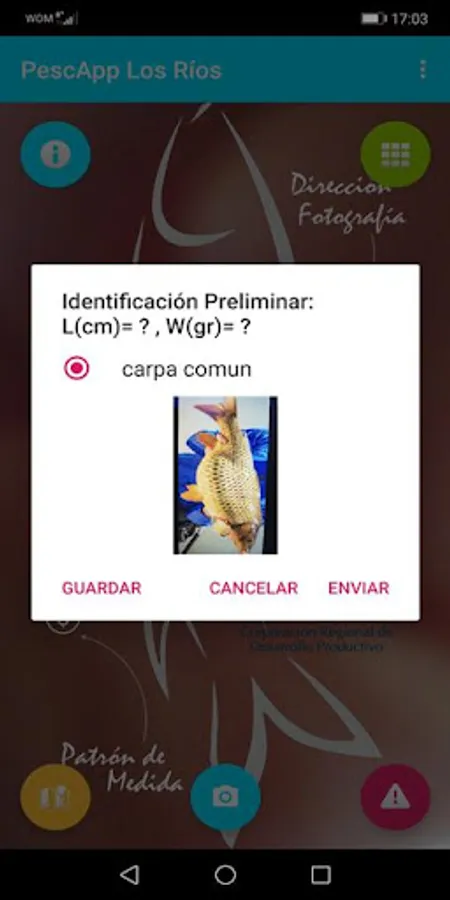 This application fulfills the objective of gathering information on the status of the hydrobiological fauna of interest for recreational fishing in the Los Ríos region, in order to support the definition and management of efficient management measures for recreational fishing in the region. . On the other hand, it seeks to make more efficient the collection of information on the catches regarding the fishing days, which to date is done through fishing cards, which are delivered to the public through guides and clubs. of fishing, of the municipalities and of the Zonal Directorates of Fisheries.