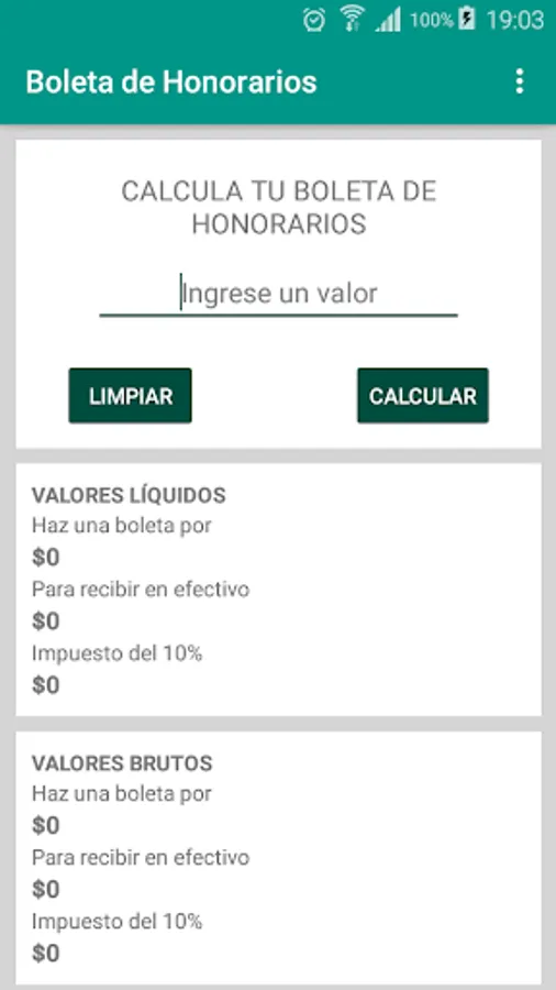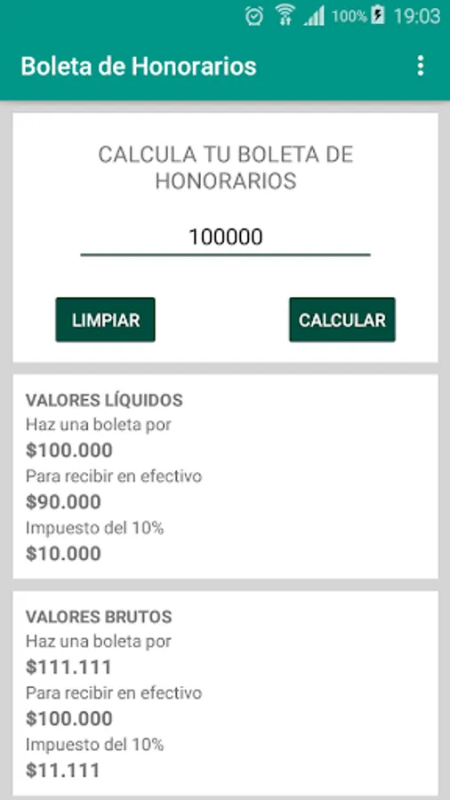 This application will help you calculate quickly and easily your fees, you should only enter the amount and this will show fluids and gross values with the respective tax of 10%, and prodrás be clear about the values that make your report card fees .