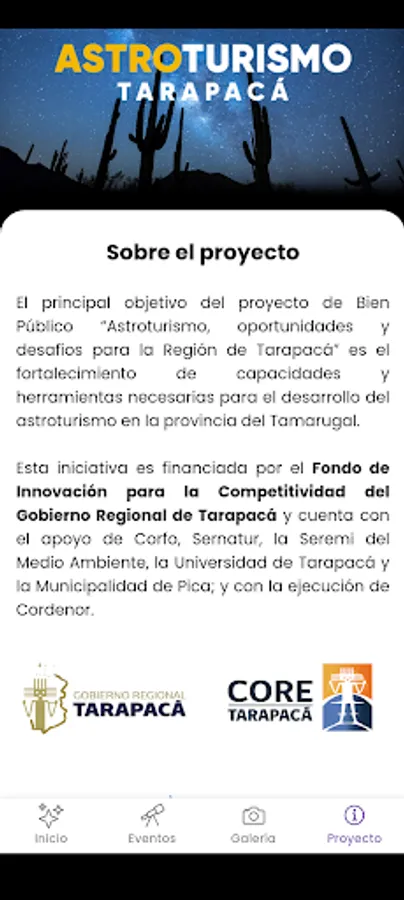This application is part of the Public Good project "Astrotourism, opportunities and challenges for the Region of Tarapacá", an initiative financed by the Innovation Fund for Competitiveness of the Regional Government of Tarapacá.