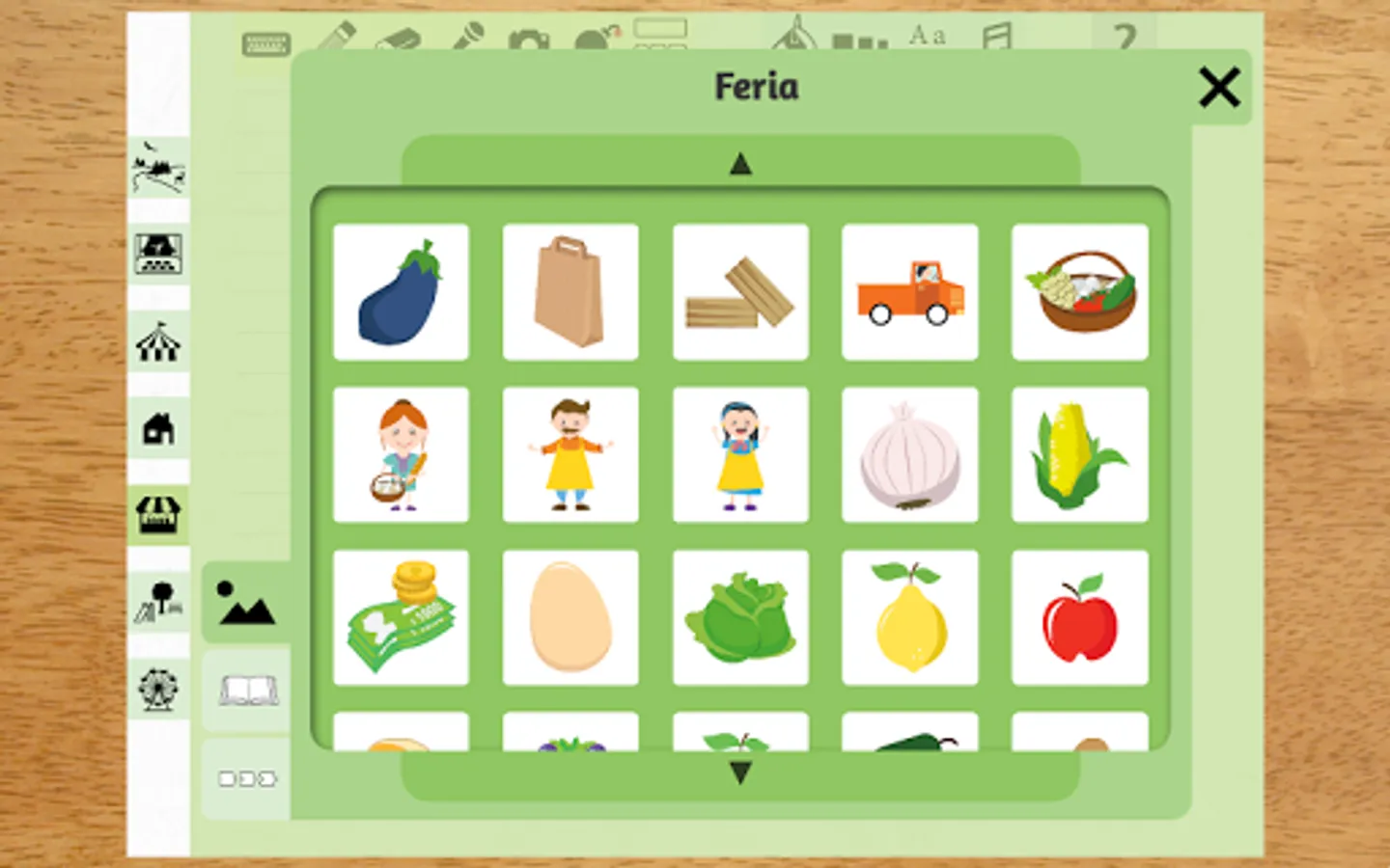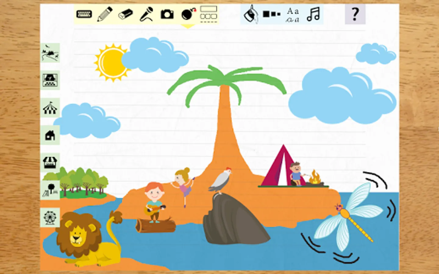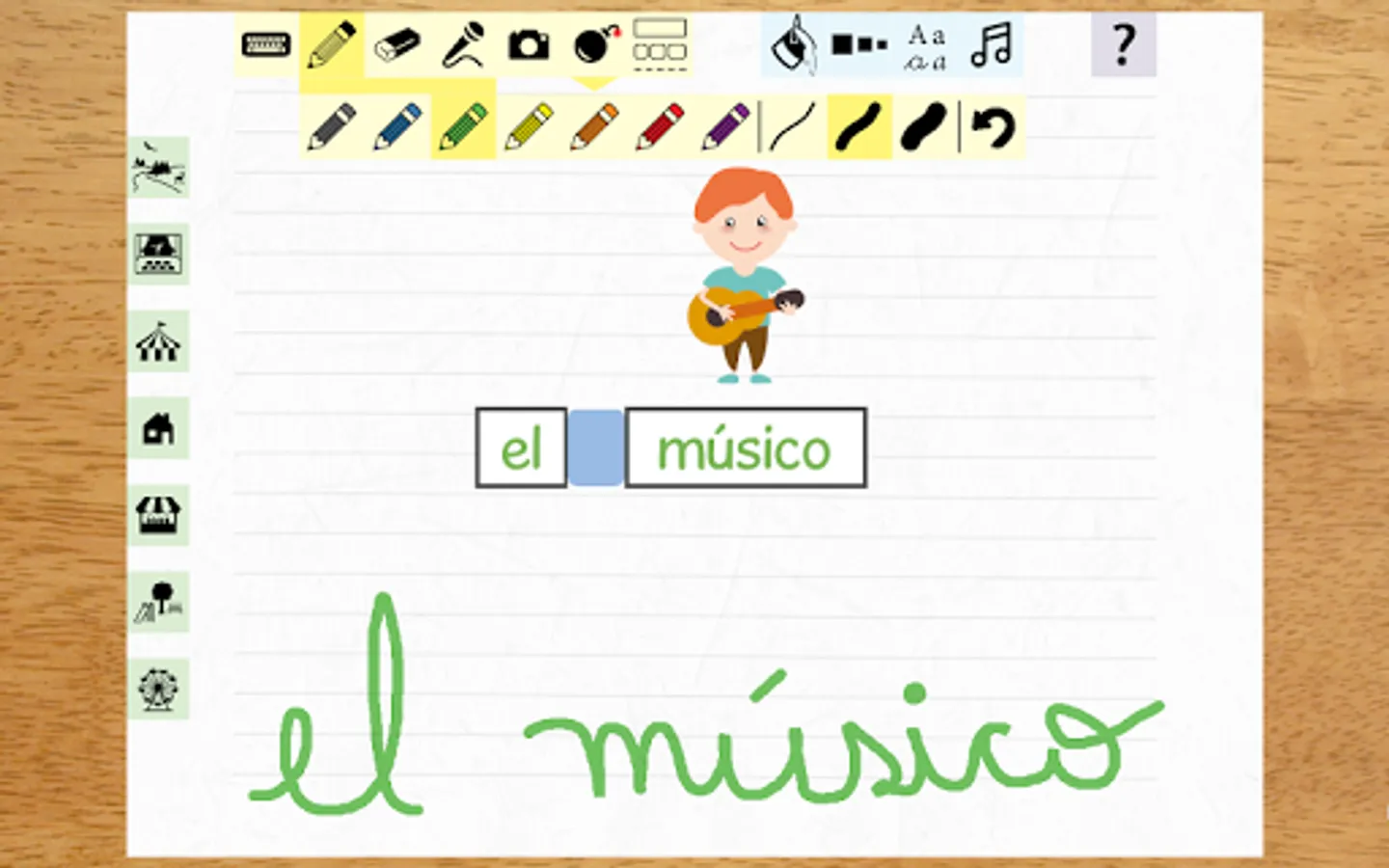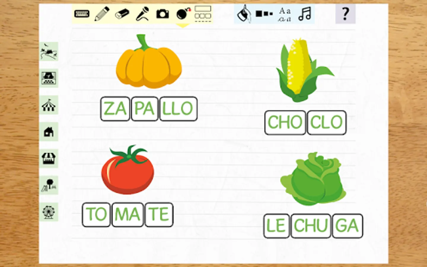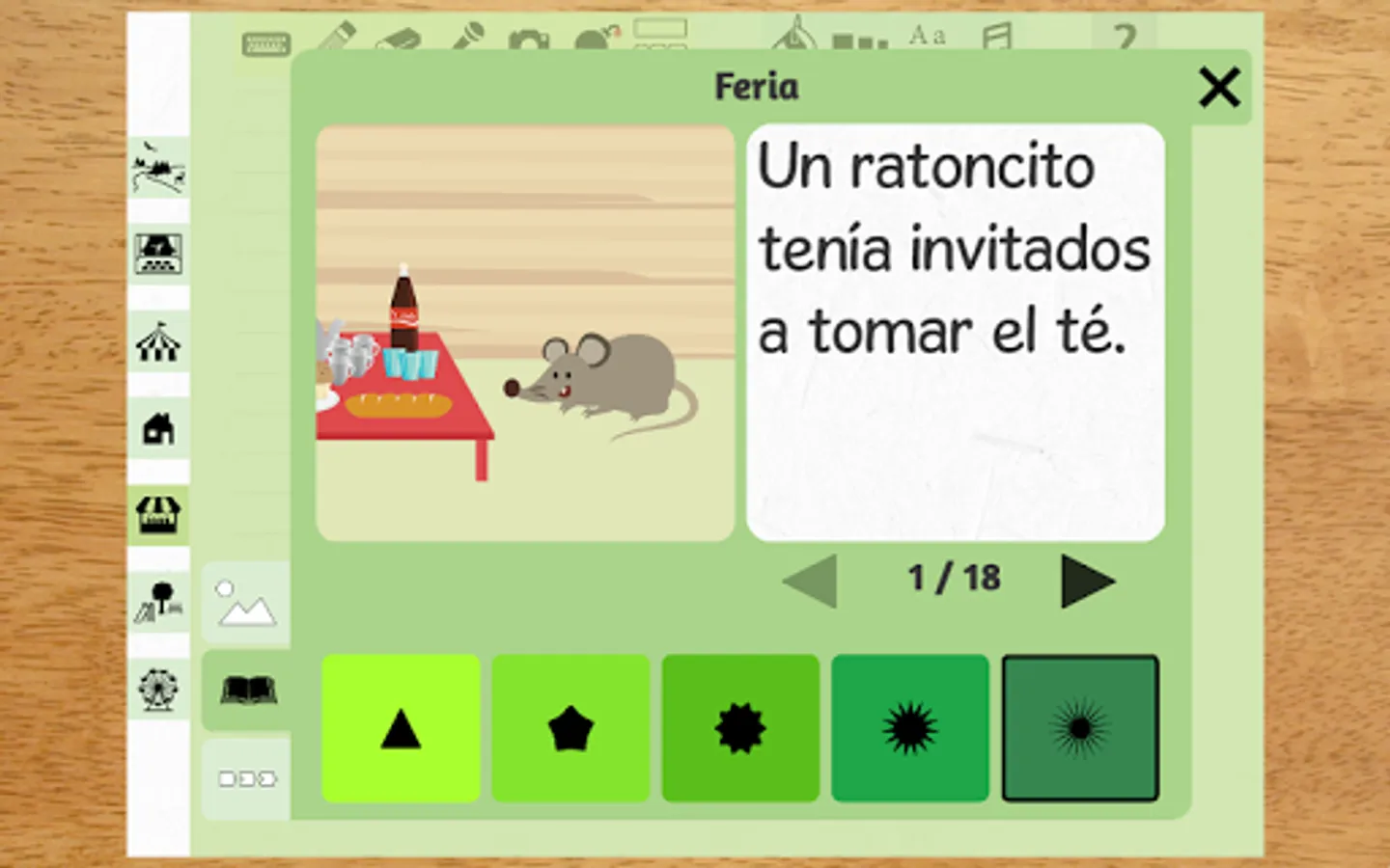 This virtual desktop will allow the girl or boy seven worlds to explore different themes, containing different images associated with his words, as well as stories with embedded audio and ordering stories through picture cards. The user can write with the board of letters from grapheme to phrases or sentences that can be read by the application, you can write or draw by the Pencil tool, will discuss entertaining way with the microphone, change the color and size objects in the desktop, add musical notes to objects or to explore the various shades of these later create rhythms. You can also change the font of the words presented, segmented words into syllables or letters, you can make screenshots of the application to have records of their work and progress, use rubber or pump to remove stimuli. In addition, you can count on the help button, which allows the mediator more information on the operation of sections and application tools.