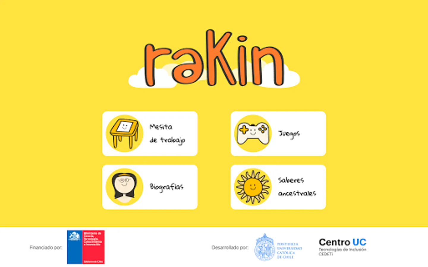 Rakin is a Mapuche word that means to count. With this word we wanted to name this free application designed to stimulate math skills in kindergarten children. The main core of the application is a virtual desktop where toddlers, together with their parents and educators, will be able to learn and practice early mathematical skills such as serialization, classification, conservation of quantity, notion of number and numbers. The application has a games section where stimulated mathematical notions can be practiced on the virtual desktop. It also has the biographies of women of different times, ages, countries and disciplines who have made important contributions to science. In addition, the application has a section where the main scientific contributions of some Latin American cultures and peoples are described.